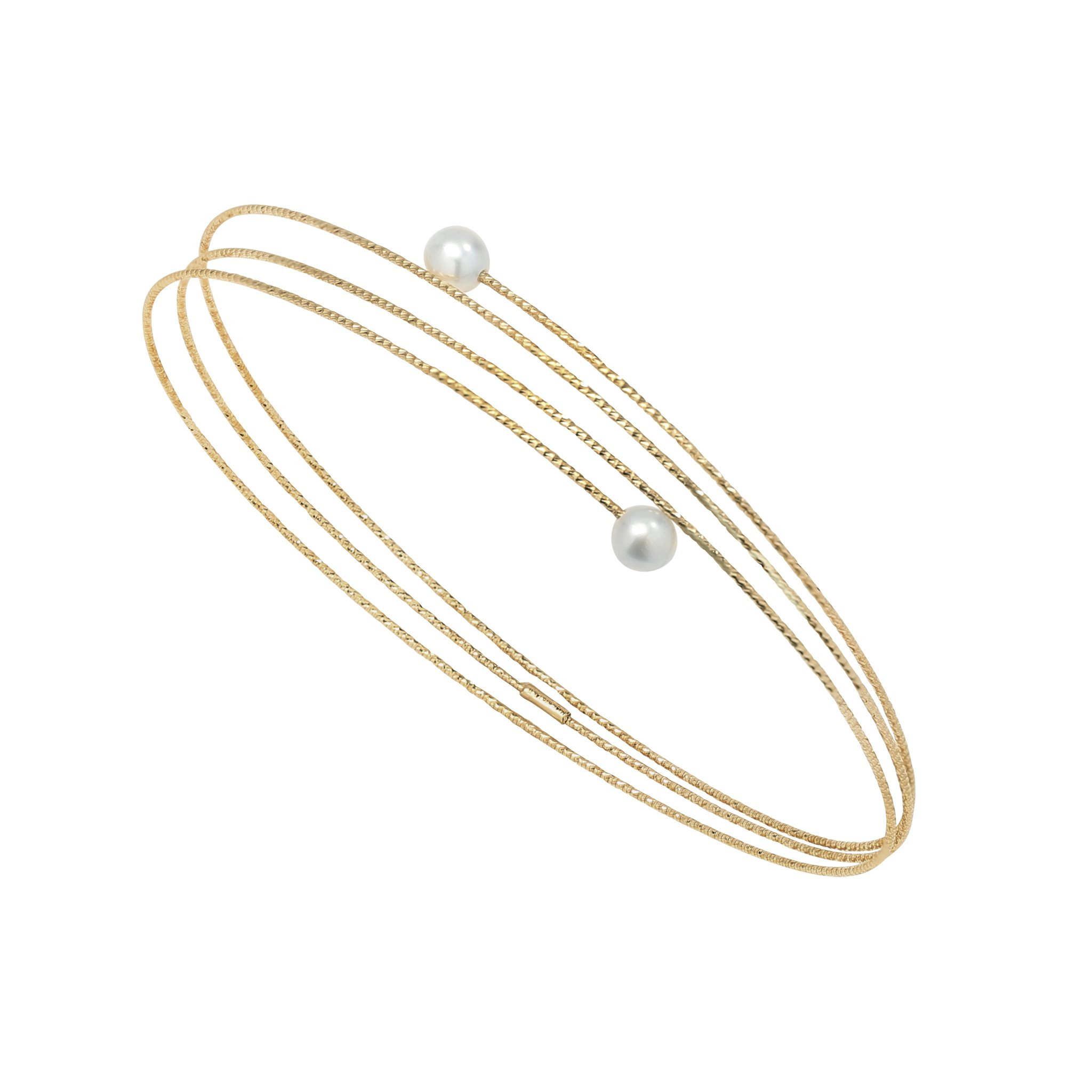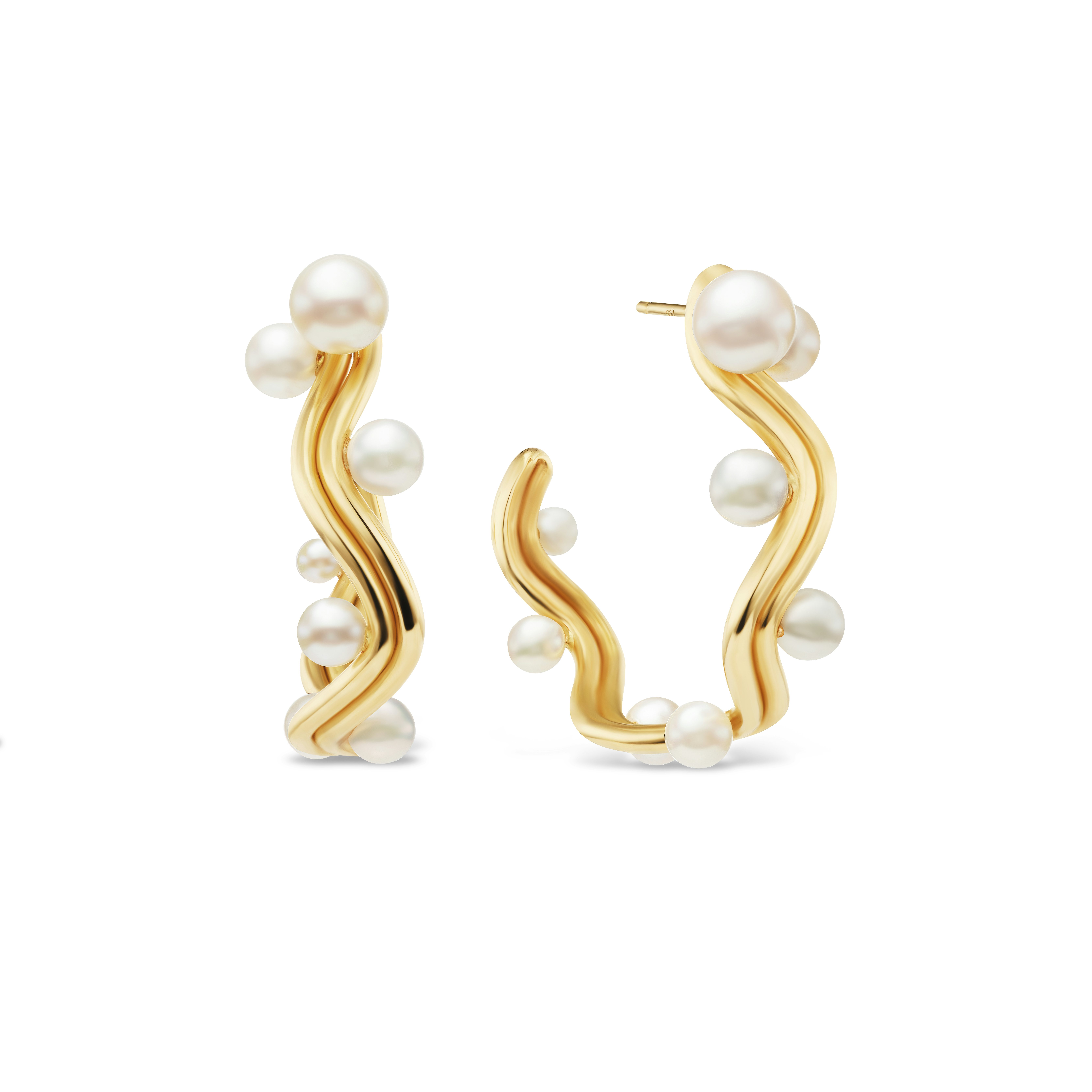 Mimicking the fluid motion of the tide, with luminous pearls delicately spaced like notes, these Wave Pearl Hoop earrings are handcrafted in 18-karat yellow gold with Akoya