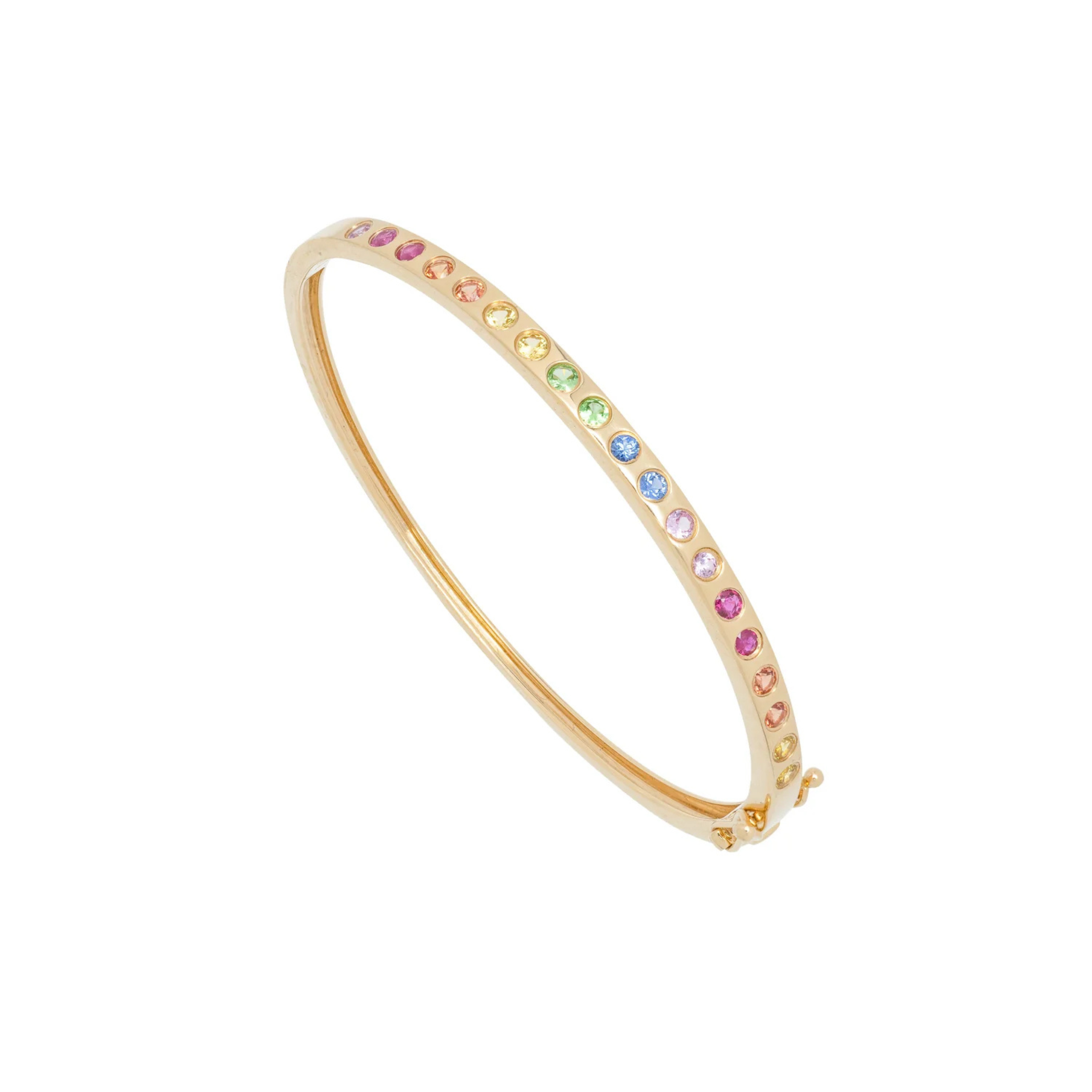 Elevate any outfit wearing the Rainbow Bangle from Ali Weiss Jewelry. Showcasing a mix of vibrant colored sapphires set in 14-karat yellow gold for a stunning display of individuality. aliweissjewelry.com