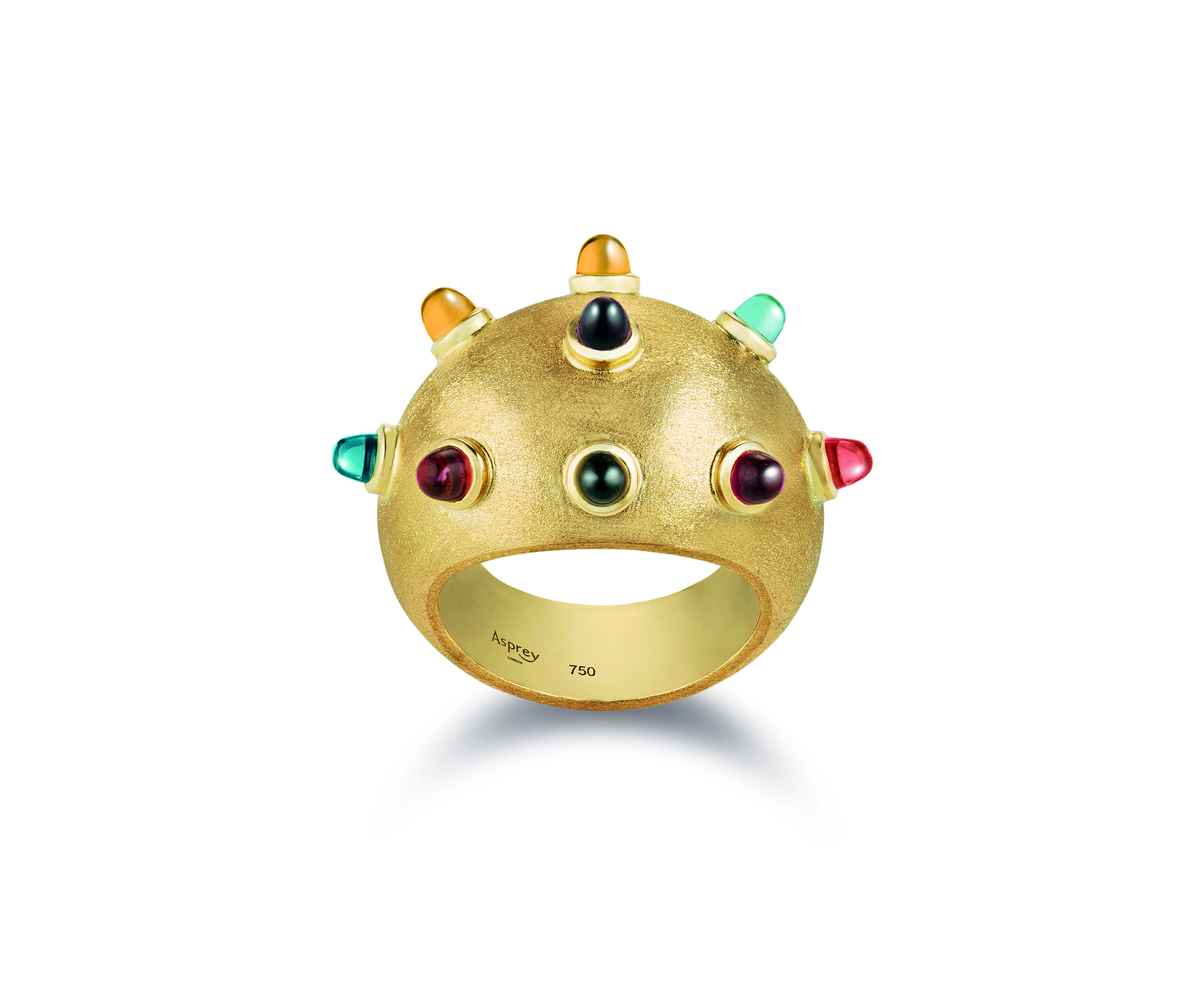 Asprey’s Ausum Sputnik Bangle is a celebration of color, texture, and cosmic wonder. This show-stopping bangle presents a dazzling array of bullet-shaped cabochons in a mesmerizing rainbow of tourmaline colors, accented by the brilliance of blue topaz and citrine—all elegantly bezel-set in textured 18-karat yellow gold. asprey.com