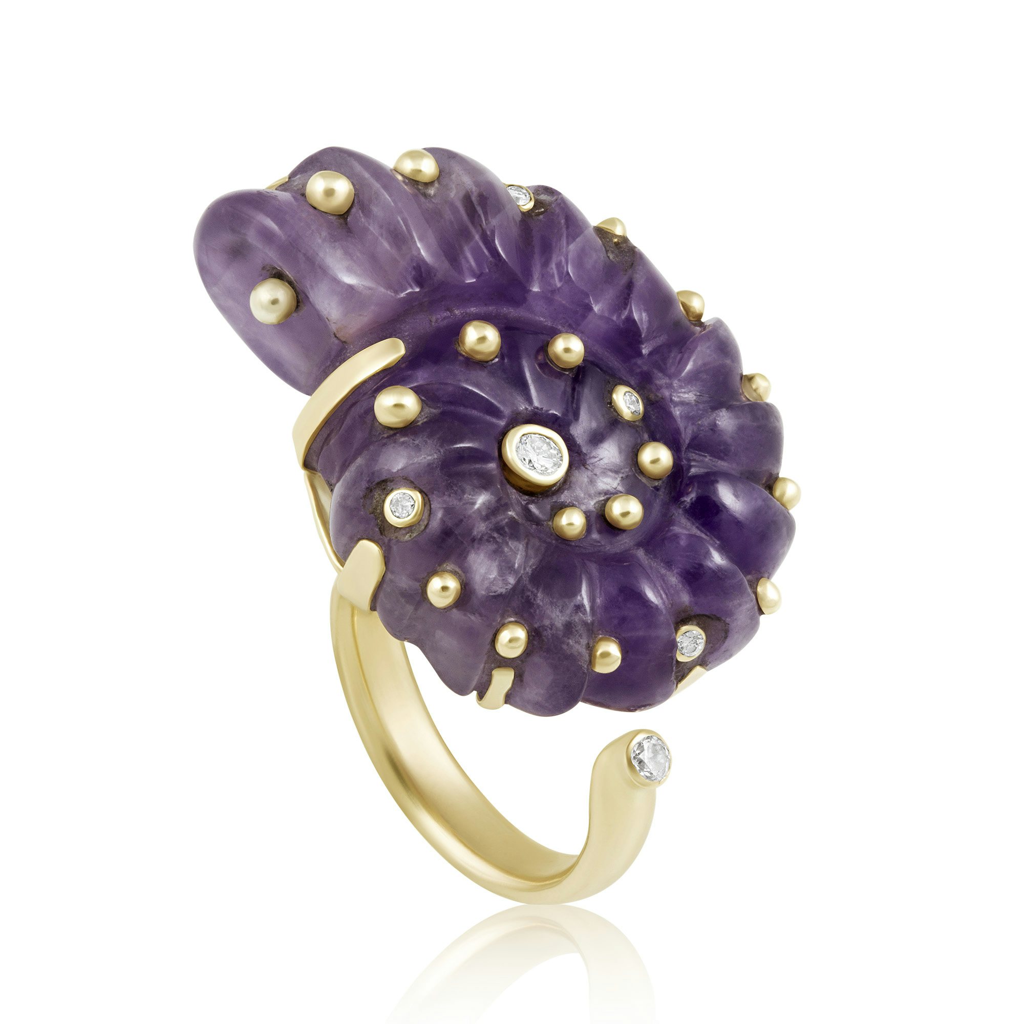 Express your individual style in the CCWW Designs by Christina Puchi carved stone Ammonite ring, featuring hand-carved amethyst ammonite with gold balls and diamonds. ccwwdesigns.com