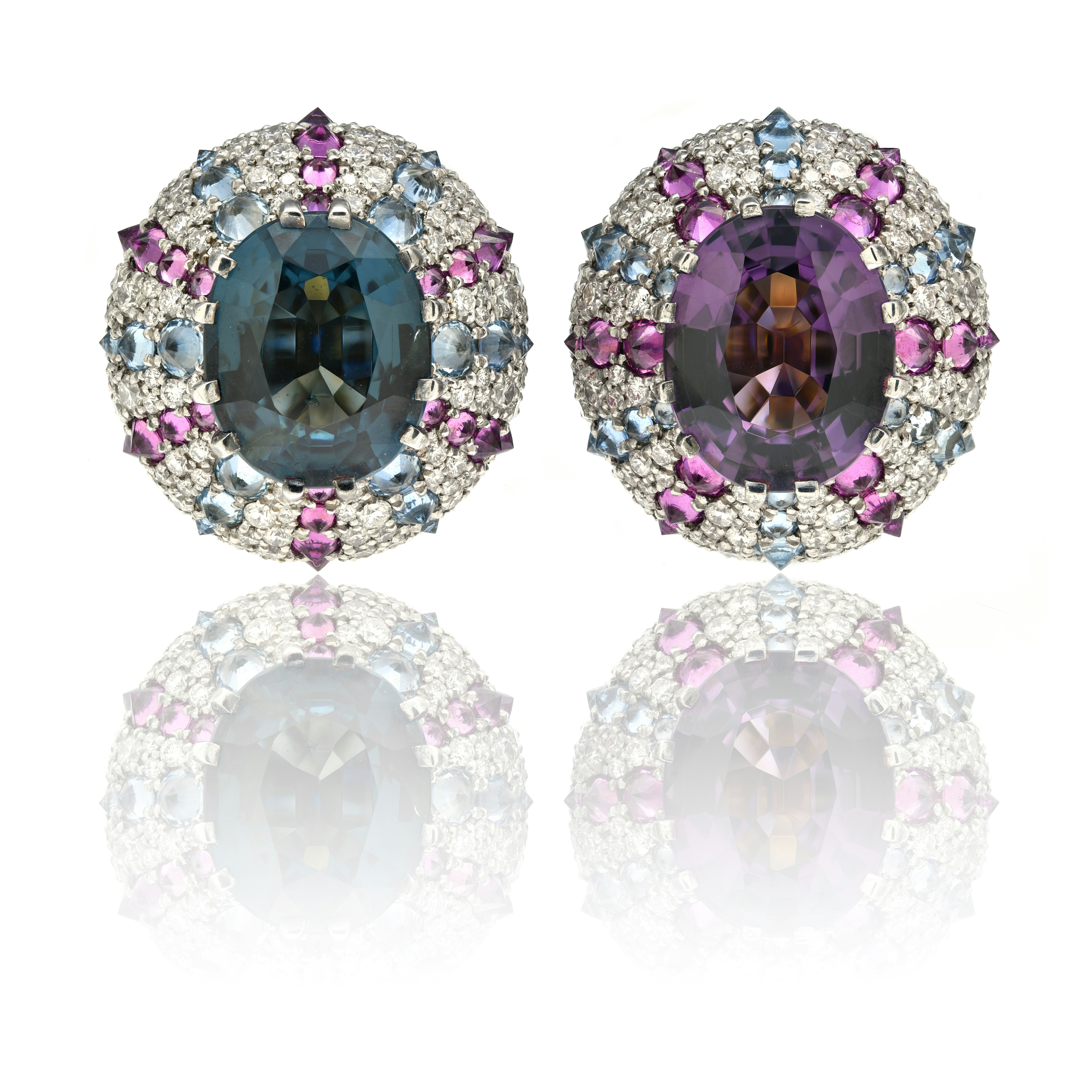 Embrace the allure of Lily Gabriella’s Sea Urchin Earrings, allowing the captivating blend of 18-karat white and yellow gold, garnets, aquamarine, and 1.88 carat GVS diamonds to showcase your refind taste. lilygabriella.com
