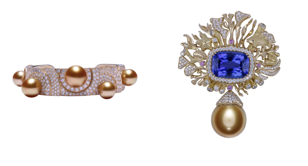 Jewelmer’s South Sea pearls and fine jewelry are a harmonious blend of French design and Asian sensibilities — each piece embodies rarity and elegance. The brand featured numerous showstopping pieces at Vegas, including the one-of-a-kind C’est La Vie Bangle. This stunning bangle is donned with 18-karat yellow gold, 10-13mm South Sea golden pearls and 8.88cts of diamonds – it the perfect, elegant accessory. Jewelmer’s La Mer en Majeste brooch is another standout piece. It features a beautiful 17mm semi-baroque South Sea golden pearl with 16.495 ct of tanzanite, 2.701 cts of diamonds and .18cts pink sapphires.