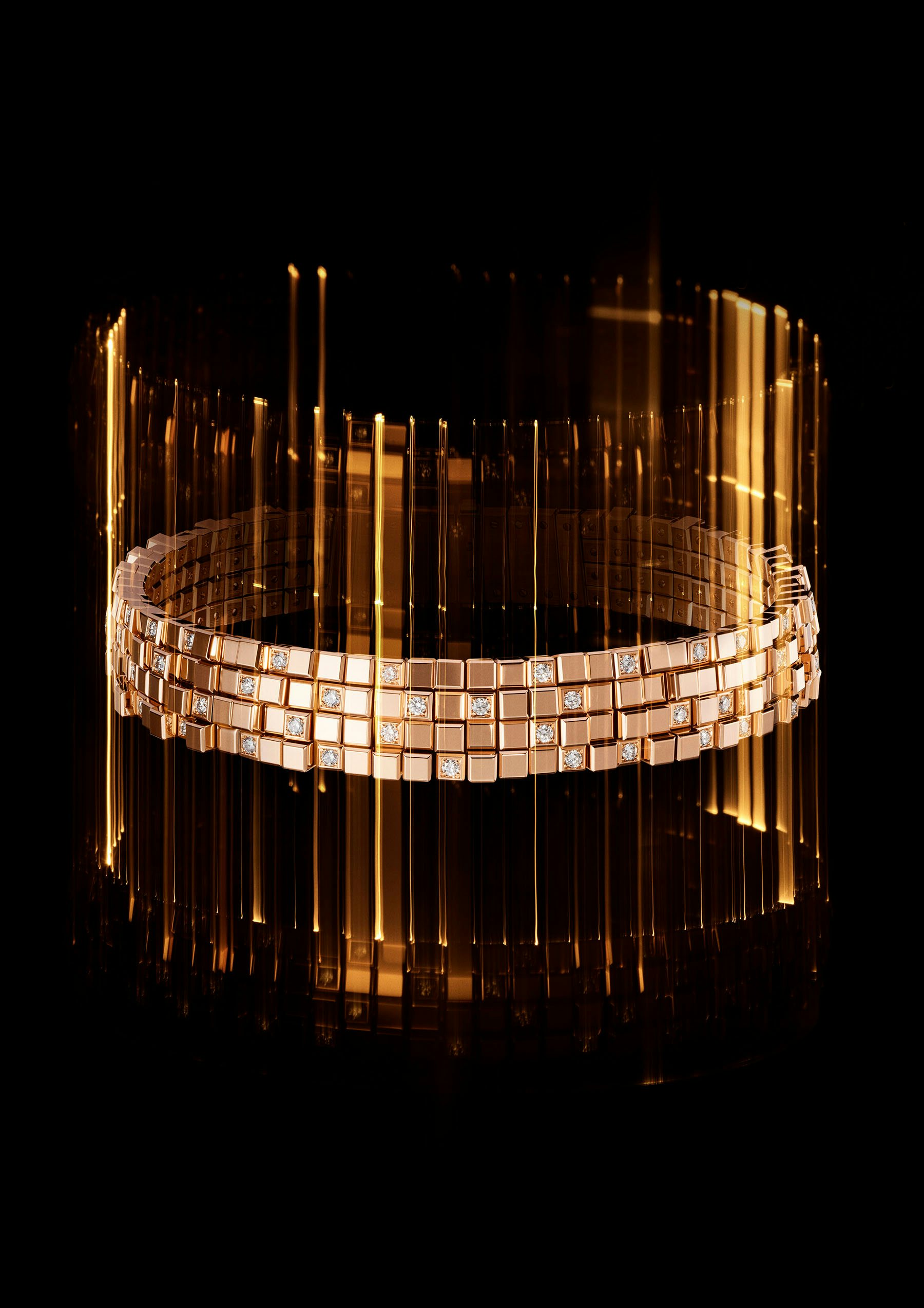 Sculpt your evening look with the glittering Ice Cube Diamond Choker and Cuff Set from Chopard’s Ice Cube Collection. Featuring 18-karat rose gold with white diamonds. chopard.com