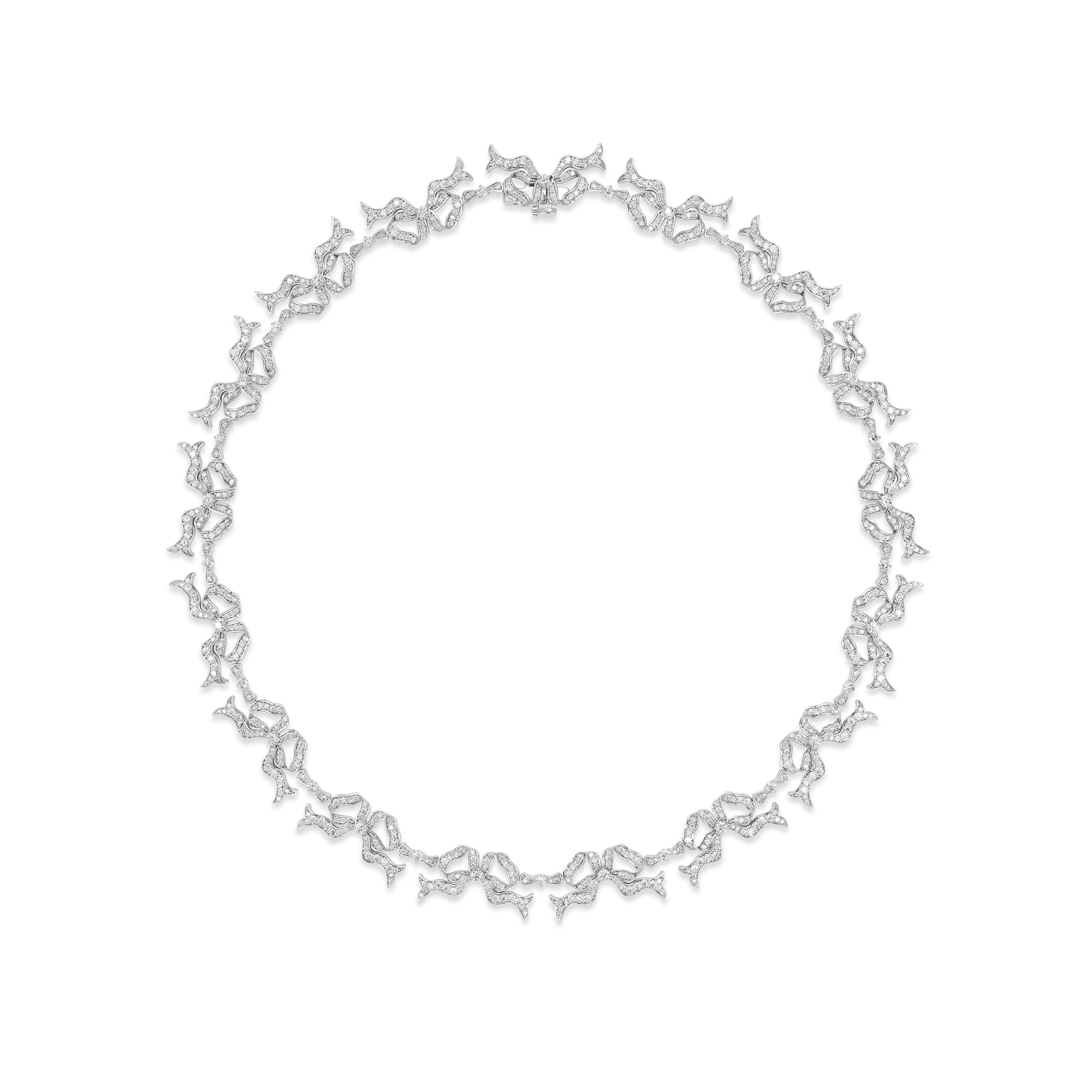 Symbolizing timeless love and sophistication, Akaila Reid’s 18-karat white gold Bow Eternity Necklace with diamonds will add a charming touch to evening wear. akailareid.com