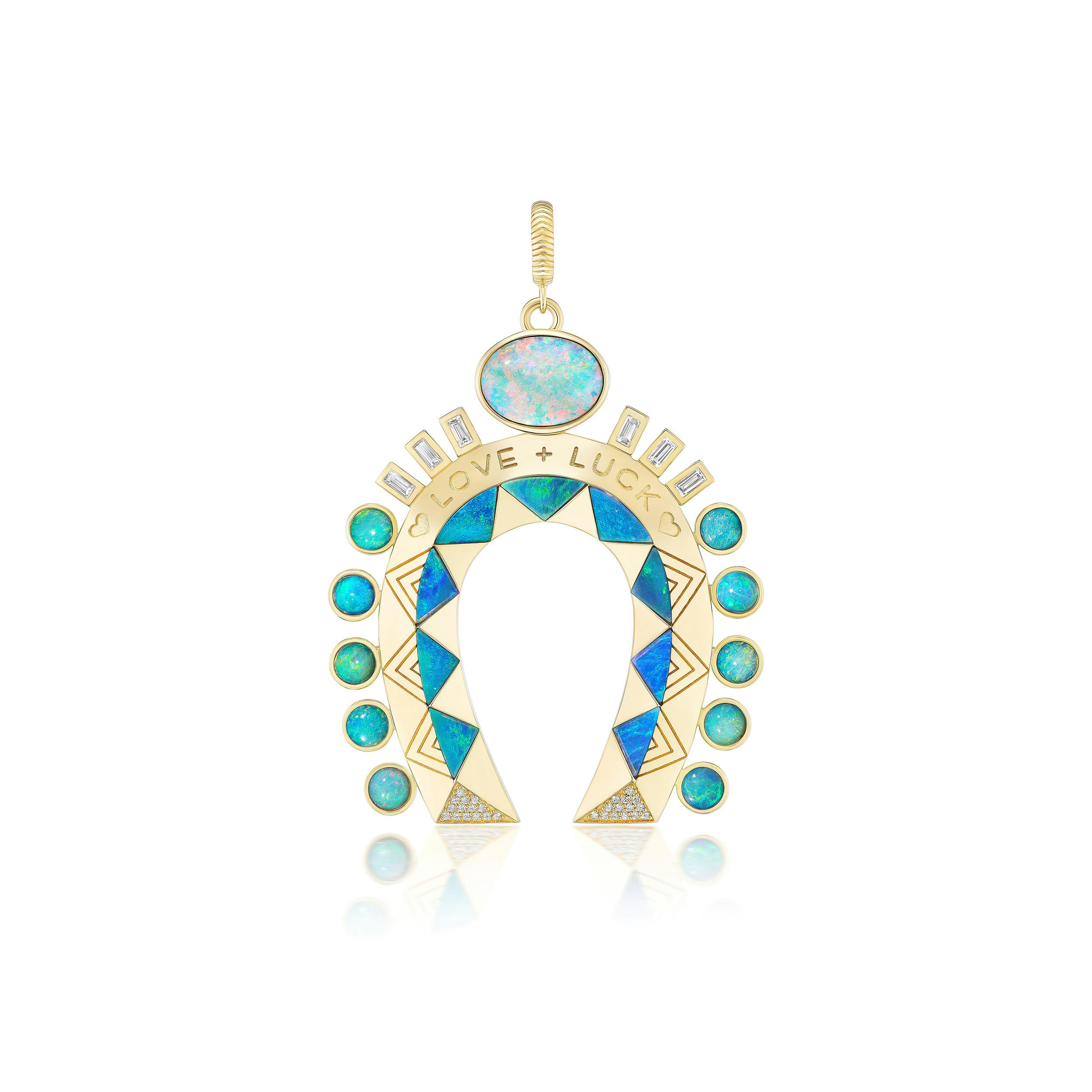 Gift luck and love with Harwell Godfrey’s Opal Horseshoe necklace. The 18-karat yellow gold pendant features an opal center, complemented by a geometric stone inlay with opal cabochons and diamonds. harwellgodfrey.com