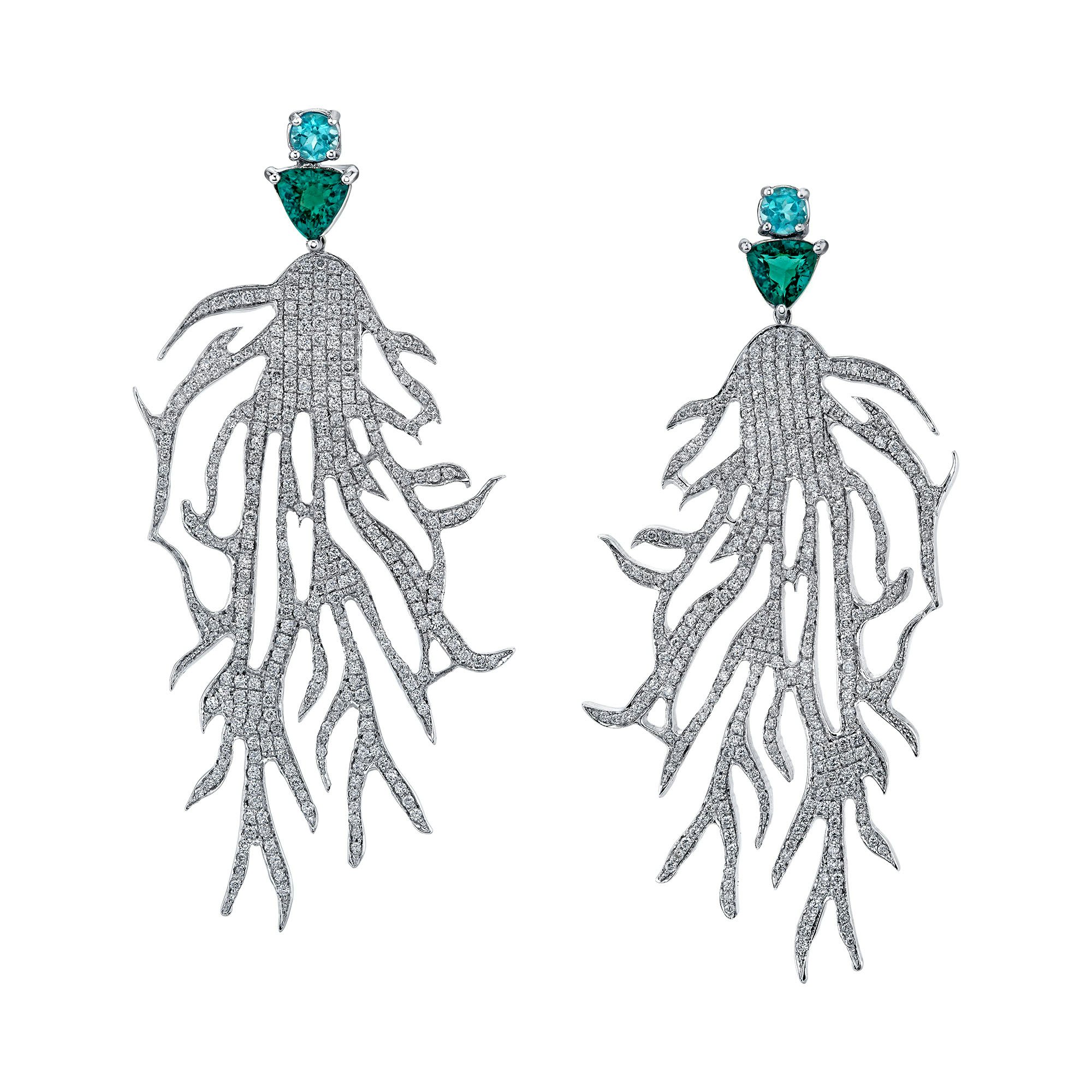 Like a tranquil sea, apatite, with its mesmerizing hues of blue and green, embodies the essence of love and clarity. Karma El Khalil uses this enchanting stone in these Coral Earrings with 18-karat white gold with diamonds and tourmaline. karmaelkhalil.com