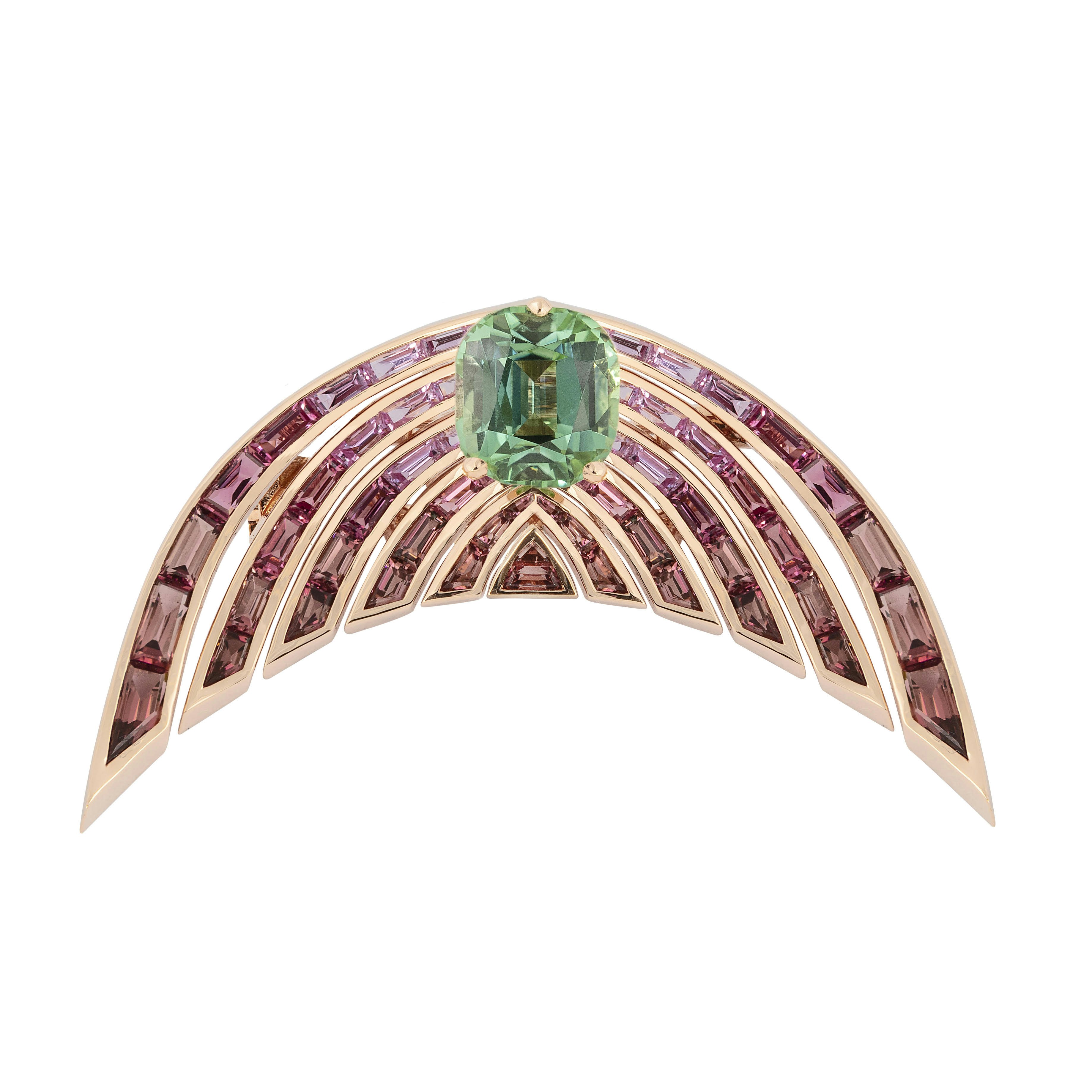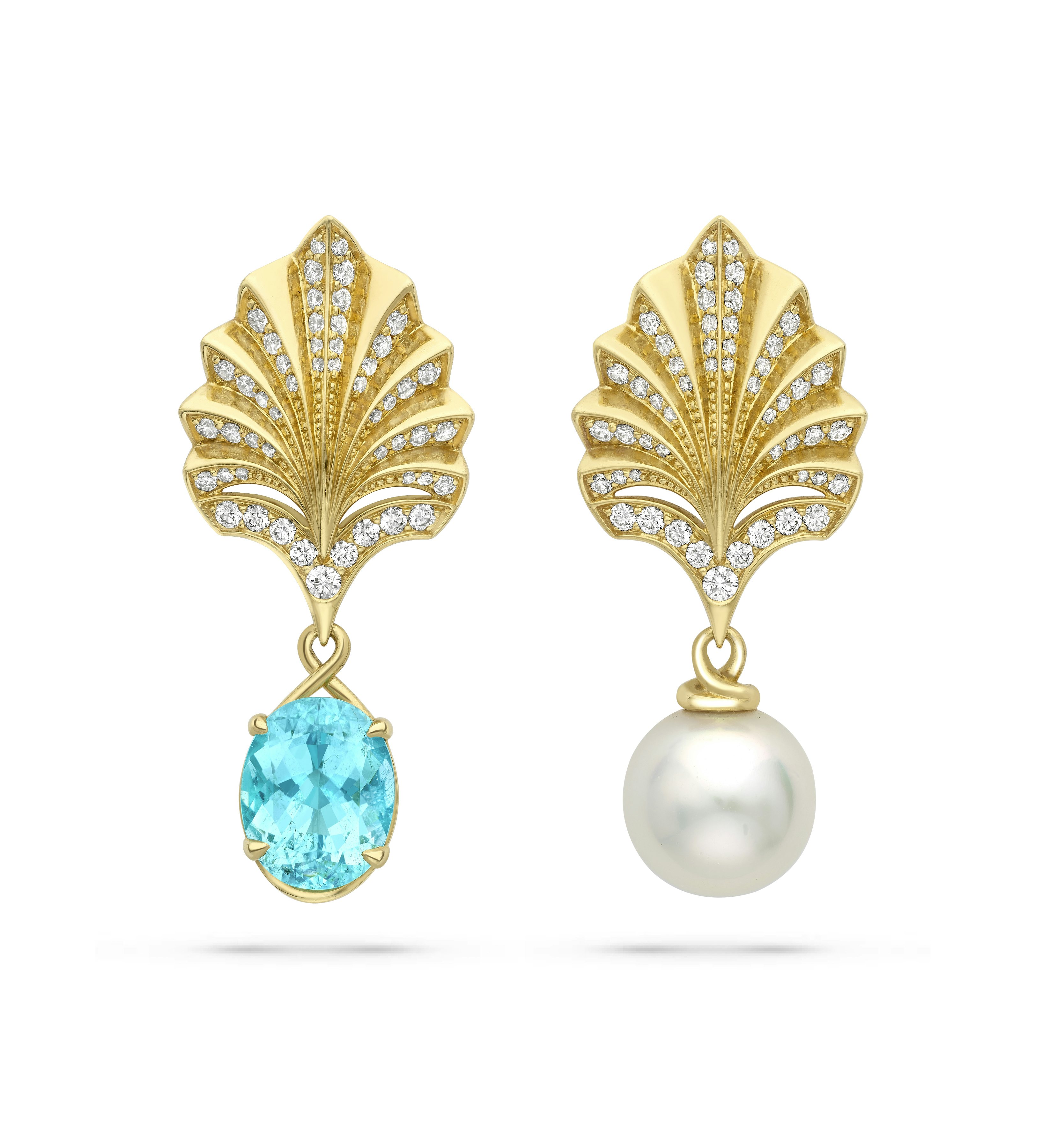 Wear the colors of the ocean with Lily Gabriella’s Sea Urchin earrings, featuring a vibrant mix of 18-karat white and yellow gold, garnets, aquamarine, and 1.88 carats of dazzling diamonds. For a finishing touch, make waves with the Manta Ray brooch, crafted in 18-karat rose gold with 3.41-carat mint tourmaline, and 3.91-carat sapphire and tourmaline. These pieces capture the playful and colorful side of the sea, adding a ripple of intrigue and creativity to any outfit. lilygabriella.com