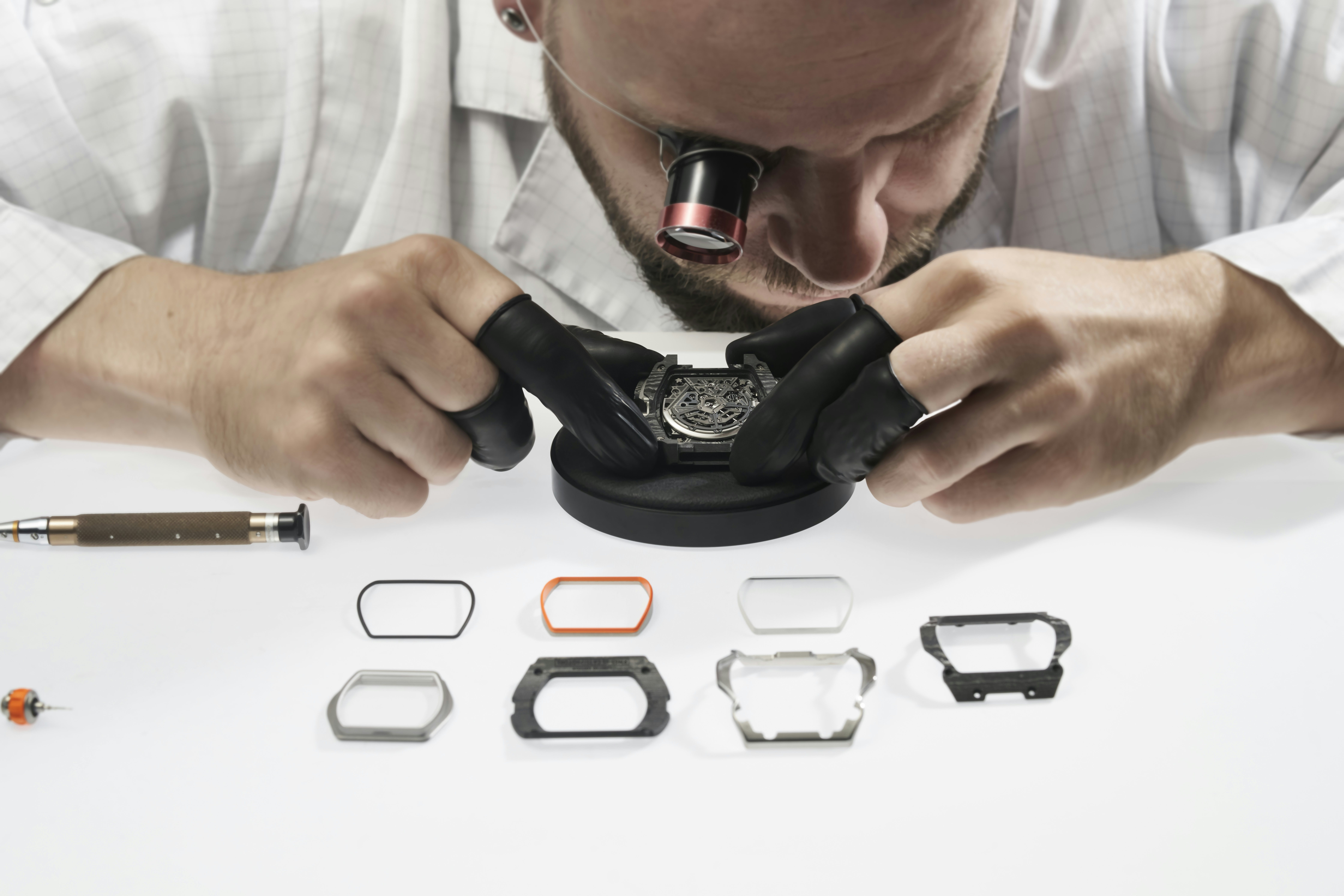 The carbon TPT®️ case of the RM 65-01 McLaren reflects the supercar’s thoughtful design features. To capture its essence, watch designers started with the view of the car from above. The car’s aero-cell architecture informed the watch’s indented double bezel, which posed one of the greatest technical challenges in the development of the watch. It required nine months of work, and eight prototype designs. Richard Mille also developed a new skeletonized titanium dial based on the W1’s wheel rim patterns to evoke the feel of a supercar’s dashboard while making the watch easier to use.