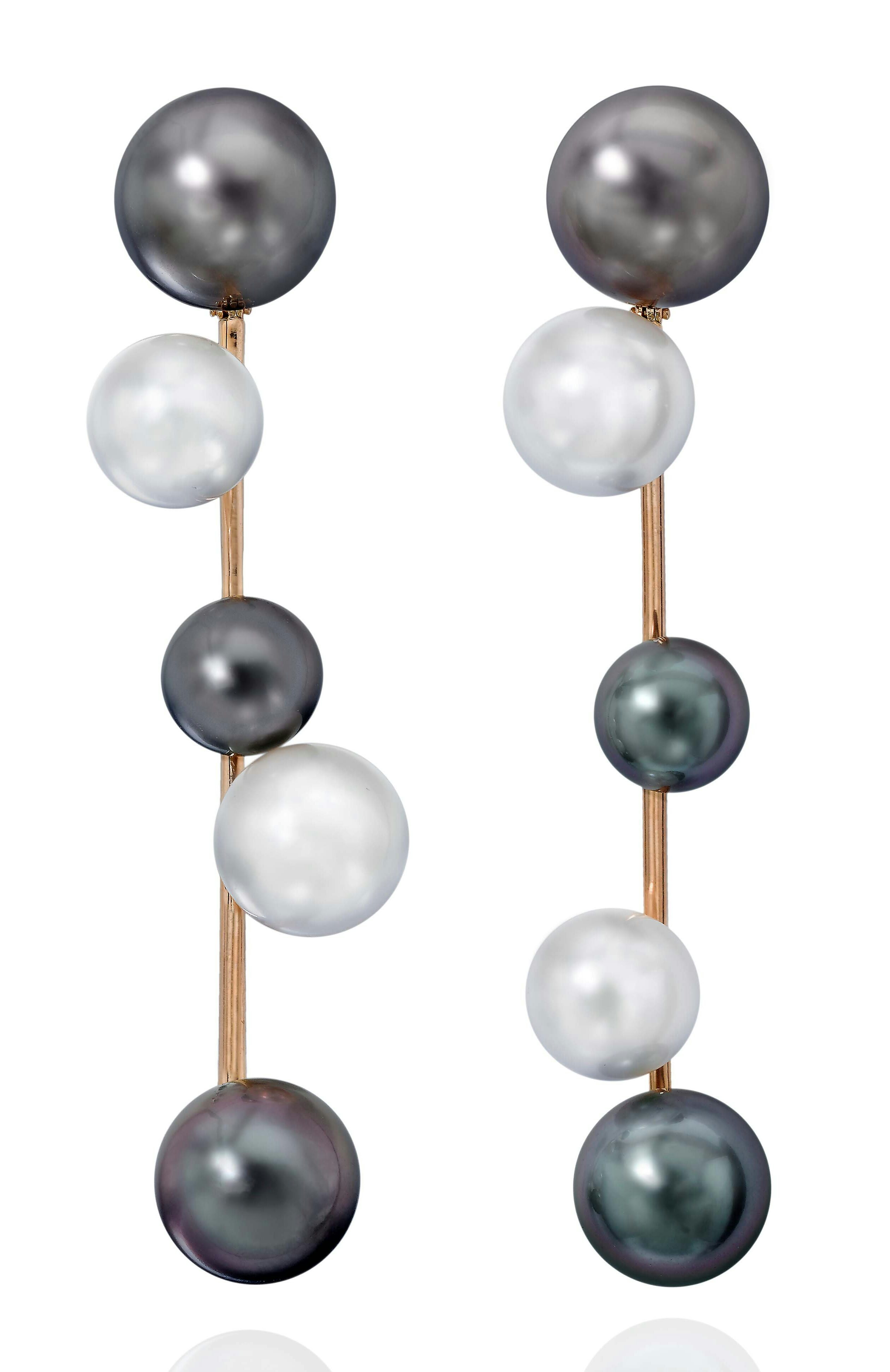 Assael’s South Sea and Tahitian natural cultured pearl modernist earrings feature six South Sea round pearls and four Tahitian pearls with 8-karat yellow gold posts and backs.