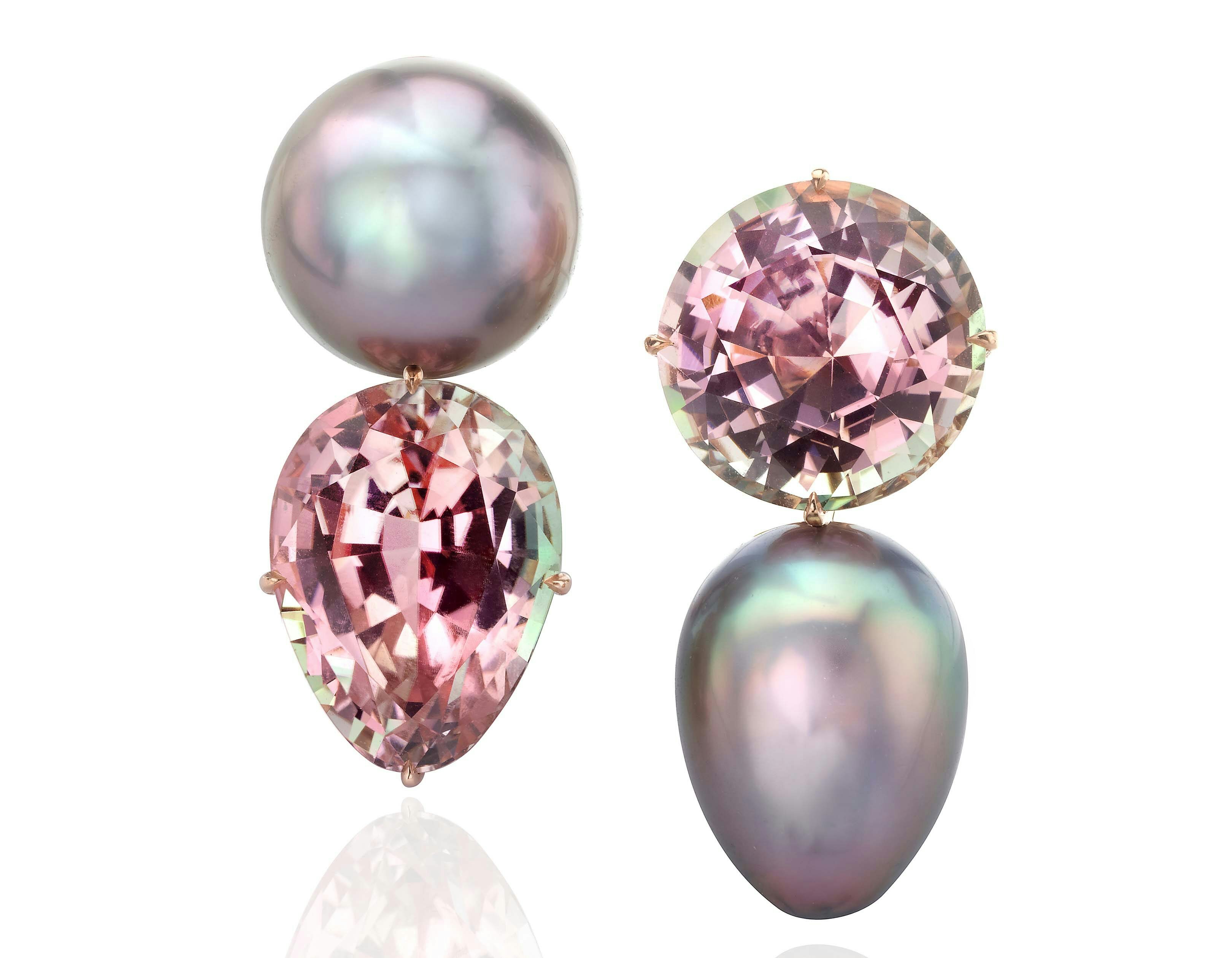 A thoughtful gift, these “in- reverse” bi-color tourmaline and Tahitian natural color cultured pearl earrings from Assael feature a single round pearl, single drop pearl, and Nigerian pearl shape round tourmaline.