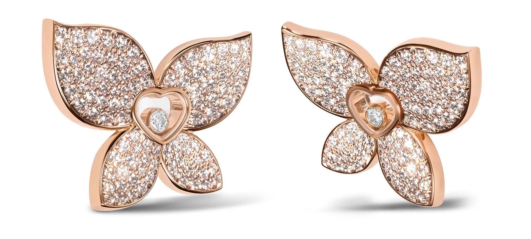 The Chopard X Mariah Carey Collection brings together the star singer and Chopard Co-President and Artistic Director Caroline Scheufele to celebrate the butterfly, a symbol of metamorphosis, brought to life with these beautiful diamond and gold earrings.