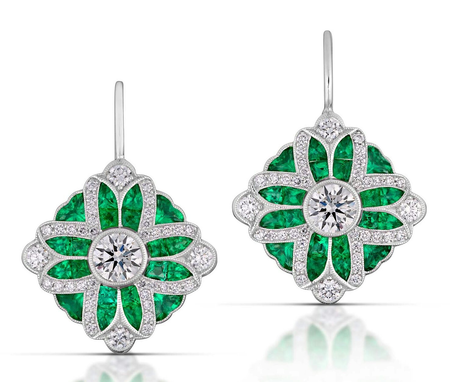 A true standout, Stephen Silver’s stunning Art-Deco style drop earrings feature a dazzling geometric array of gemstones with 1.2 carats of custom-cut emeralds and 1.1 carats of diamonds.