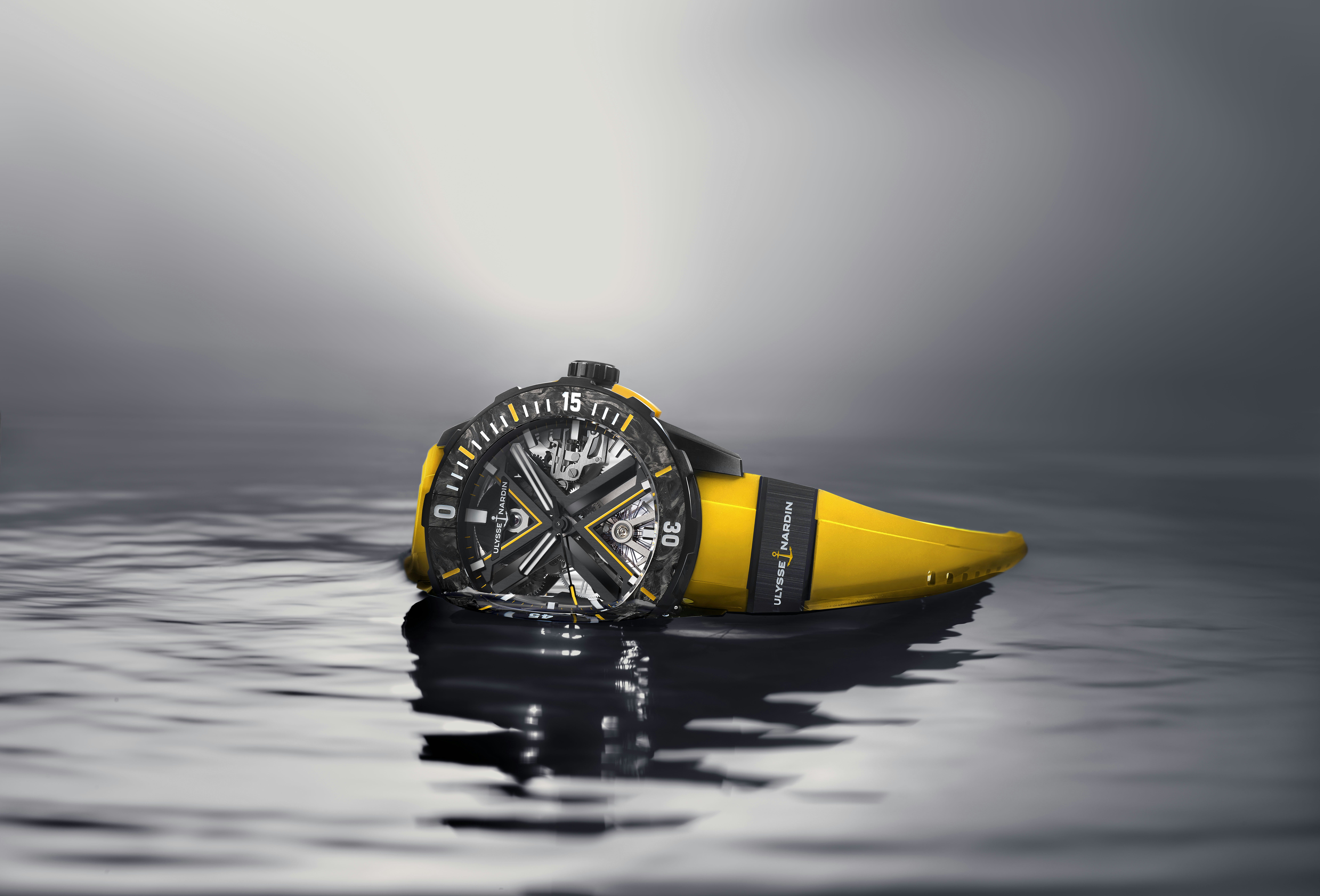The case, sandblasted on the sides with satin lugs, has been coated in black DLC. Yellow details, such as the hour markers and the internal lines of Ulysse Nardin’s signature “X,” add vibrant explosions of color and emphasize the model’s sports origins.