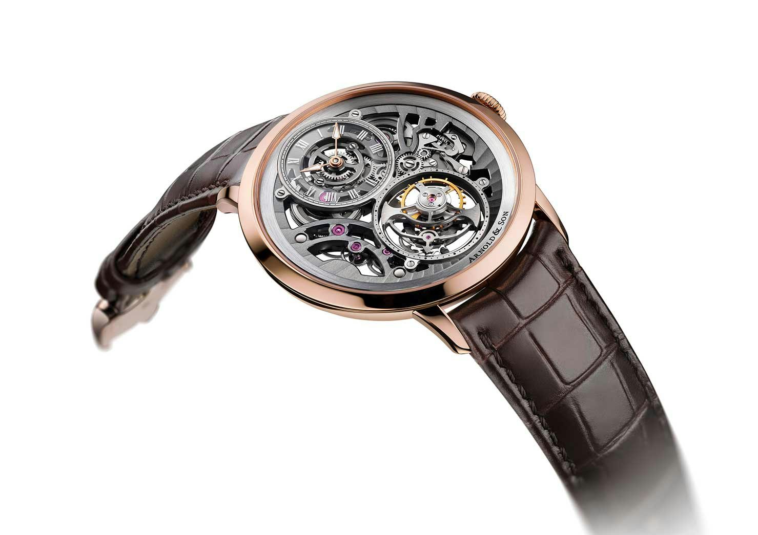 Thin is in with Arnold & Son’s new UTTE Skeleton, the thinnest skeleton tourbillon watch available. Powered by the new A&S8220 movement, the UTTE Skeleton is a completely in-house creation of the manufacture. It measures in at a slender 8.34 millimeters. In order to achieve this slight frame, the designers were tasked with reengineering the movement from scratch. The red-gold 5N case has a circumference of 42 millimeters.