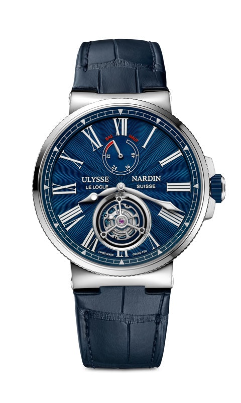 Ulysse Nardin’s Flying Tourbillon features a power reserve indicator at 12 o’clock, self-winding movement, silicium technology in a 43-millimeter stainless steel case. It’s water-resistant to 100 meters with a screw-down security crown, Sapphire crystals, Grand Feu bleu enamel dial on a leather strap with folding buckle.