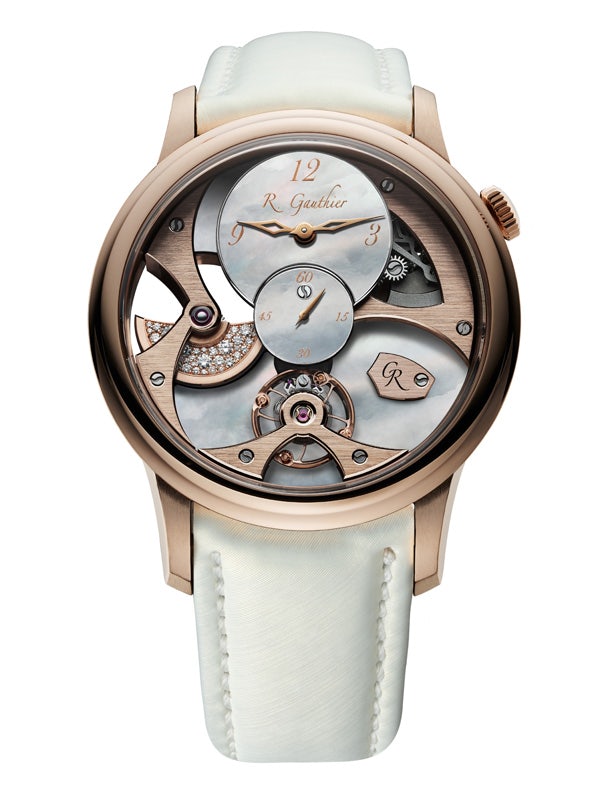 Roman Gauthier is creating for women who love complicated watches. The automatic movement featuring a snow-set micro-rotor and its gently shimmering mother-of-pearl dial is part of the master’s first ladies watch, and it’s more than a pretty face. The in-house caliber boasts a bidirectional micro-rotor made from 22k gold. The front of this oscillating weight is decorated with brilliant-cut diamonds of varying sizes.