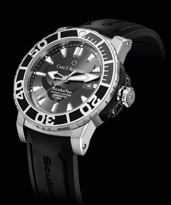 To support the oceanic conservation work of The Manta Trust, Carl F. Bucherer has launched a limited-edition Patravi ScubaTec. Part of the sales proceeds of these 188 dive watches will help finance an entirely new kind of research expedition. Two manta rays are pictured on the ridged dial, appearing as though they are surfacing from beneath the ocean waves. The 44.6-millimeter case is stainless steel with ceramic bezel, automatic helium valve, screw-down crown, sapphire crystal with anti-reflective coating on both sides. It is water-resistant to 500 meters.