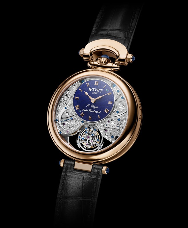Despite 472 complications, the Edouard Bovet Tourbillon’s single barrel provides a ten-day power reserve using power in three different time zones. The local time zone occupies the center of the timepiece. A dome indicating the day-and-night cycle comes in addition to the hour and minute hands. This dome turns counterclockwise to represent reality as closely as possible. The sun thereby rises in the east and sets in the west. Each of the two additional times displayed correspond to any one of the earth’s 24 time zones.