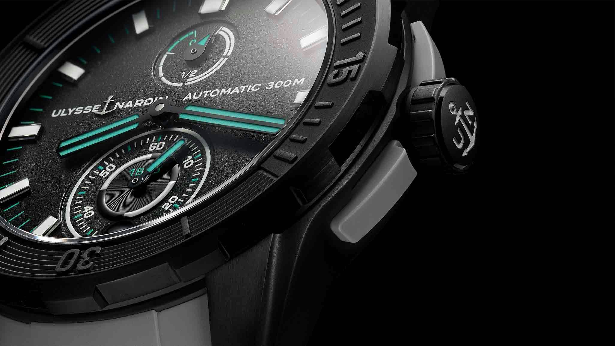 The limited-edition Diver Chronometer OMW was designed by members of One More Wave, including founder a retired Navy SEAL Alex West. Water resistant to 300 meters, it features teal and gray highlights that echo One More Wave’s logo. The black dial and DLC titanium 44mm case with turquoise accents, while the One More Wave trident logo – also black and turquoise – sits at the center of the watch’s sapphire crystal display back. Limited to 100 pieces, the Diver Chronometer 44mm One More Wave is available now at ulysse-nardin.com.