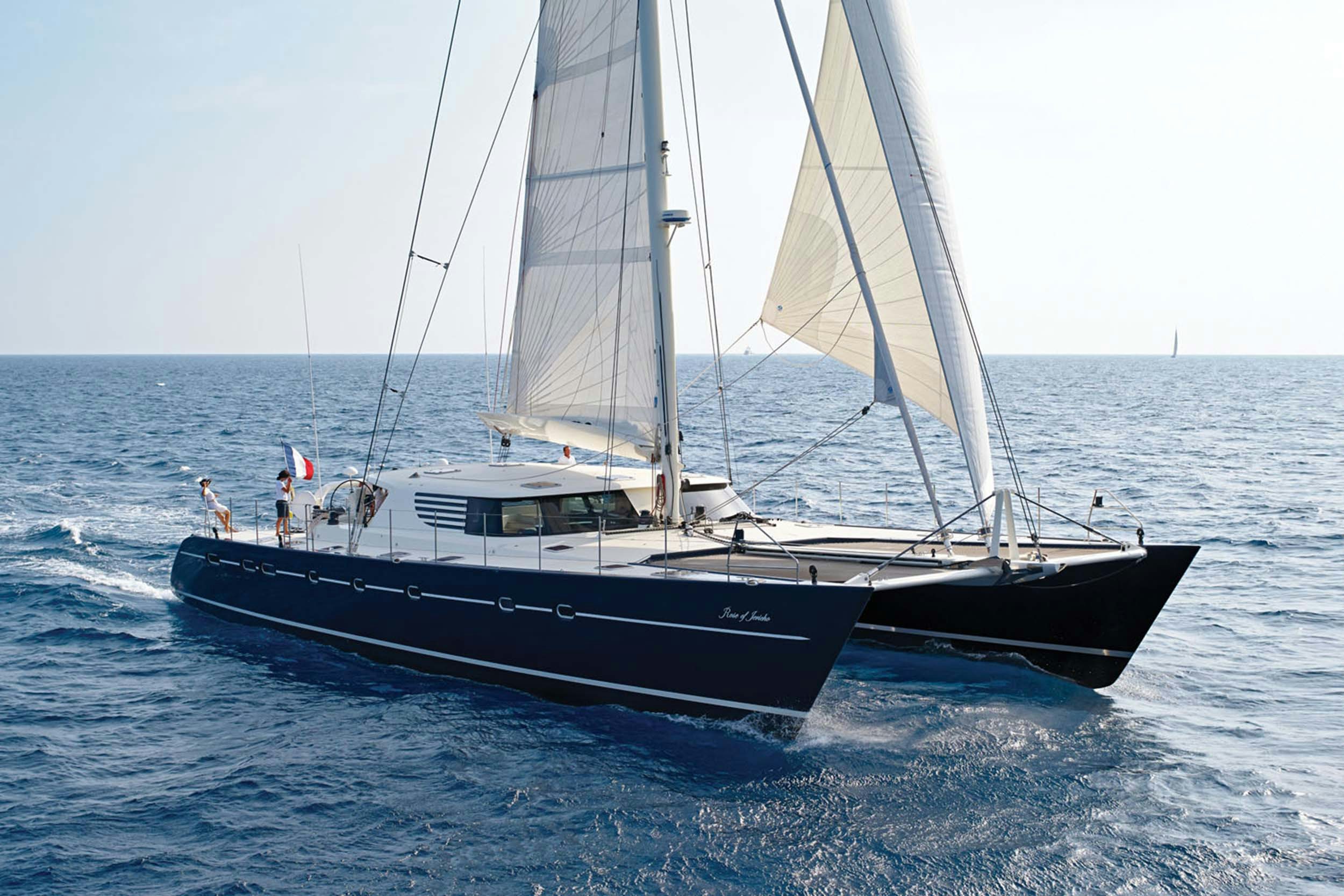 AZIZAM is a unique catamaran; she is in top shape for world cruising with a 2004 delivery and a refit in 2021. The yacht was the first catamaran built by JFA Yachts and JFA’s first project with Joubert-Nivelt. When coupled with a nice breeze, AZIZAM cruises from 12 to 14 knots both effortlessly and comfortably. AZIZAM is the ideal choice for sailing enthusiasts, having reached the equivalent of three circumnavigations around the world. The luxury yacht has accommodations for six guests and two crewmembers in a total of four cabins.