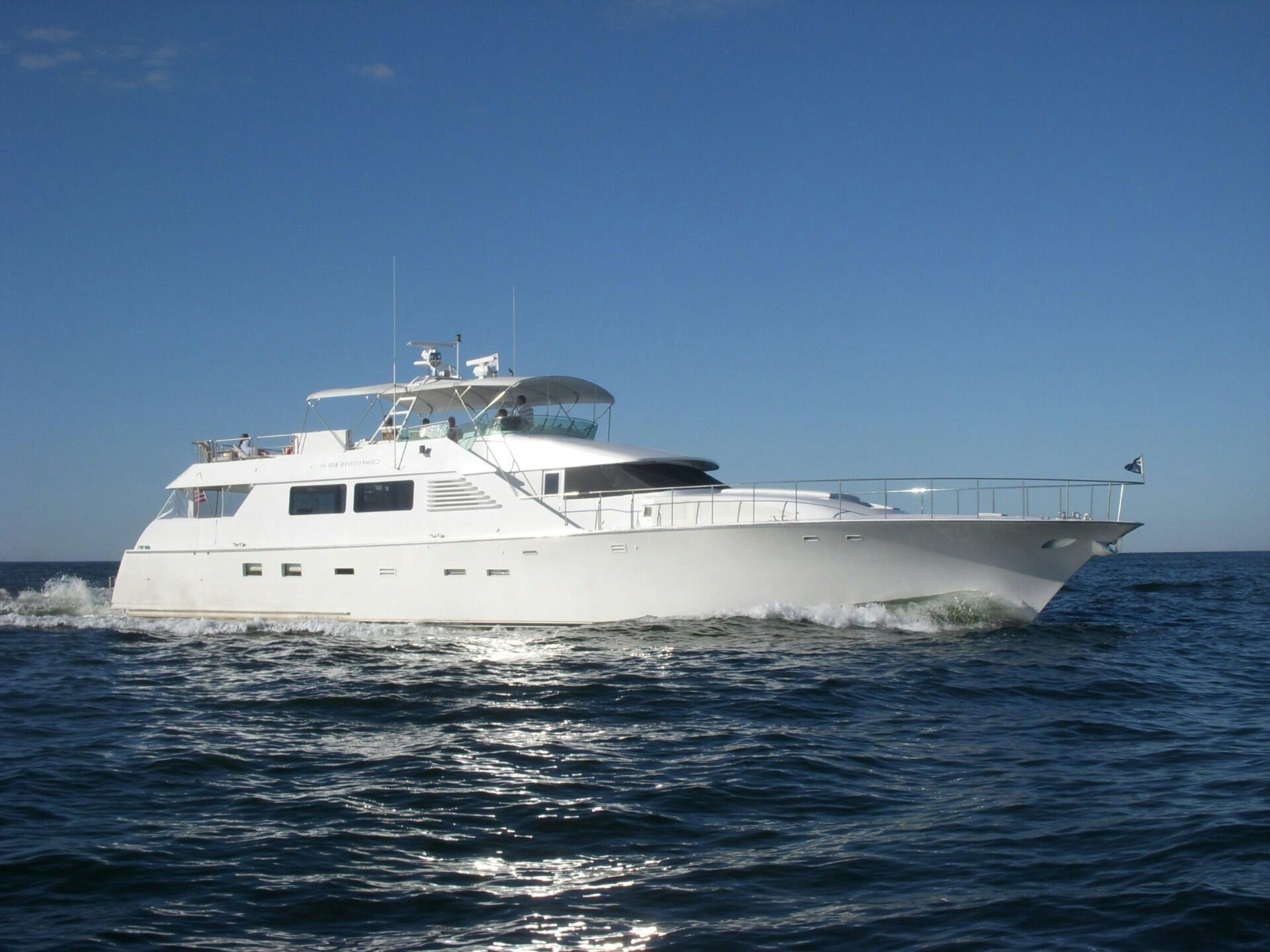 COMPETITIVE BID III is a custom Cheoy Lee 83 with an eight-foot aft extension. This extension provides more space on the sundeck and aft deck for guests to enjoy.