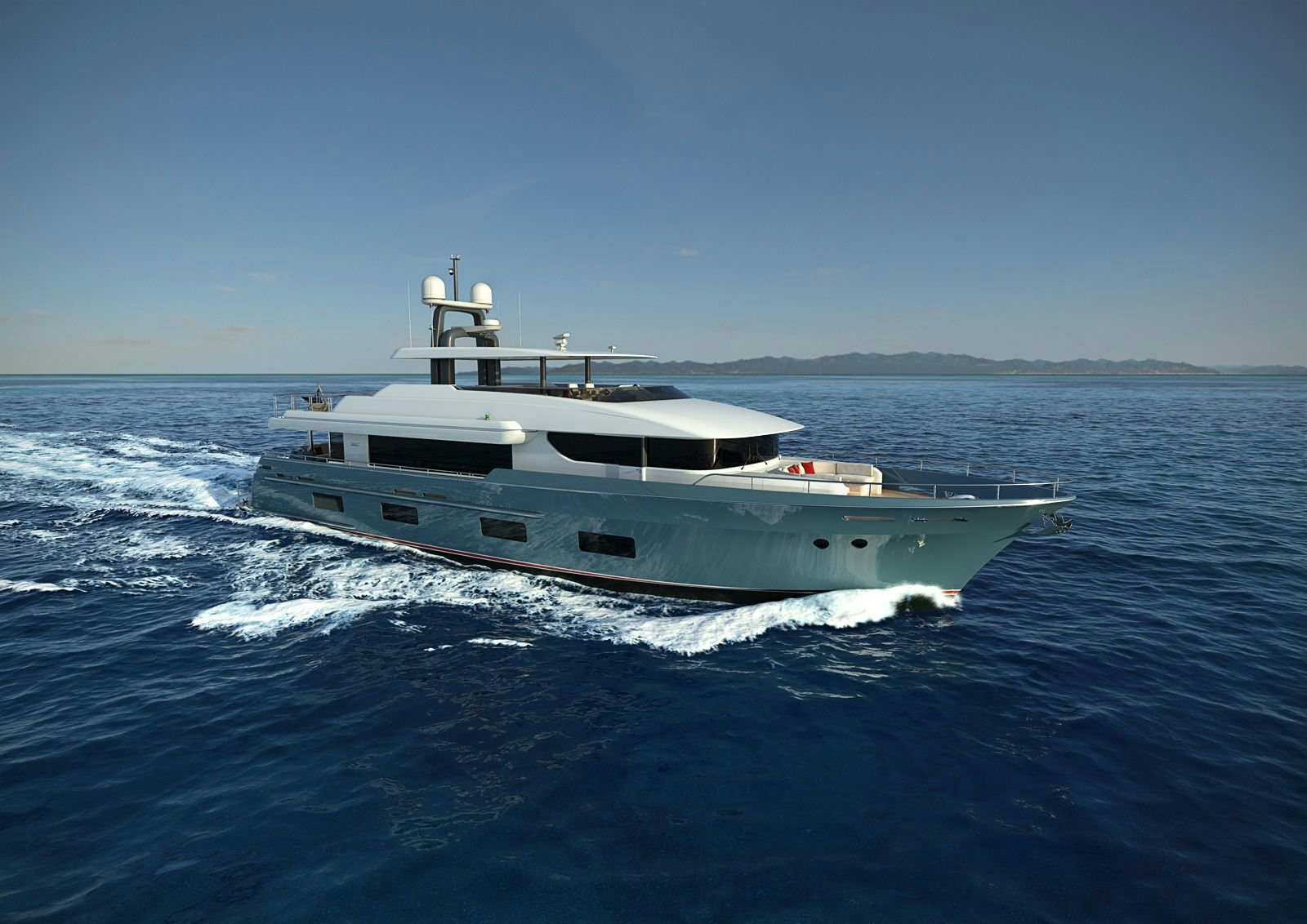 Luxury yacht CRESCENT 108 has a variety of outdoor areas for owners and guests to enjoy with several options for dining and lounging, some of which are covered by the large hardtop. The yacht is designed to carry a very large tender, which can be discussed in the design phase.