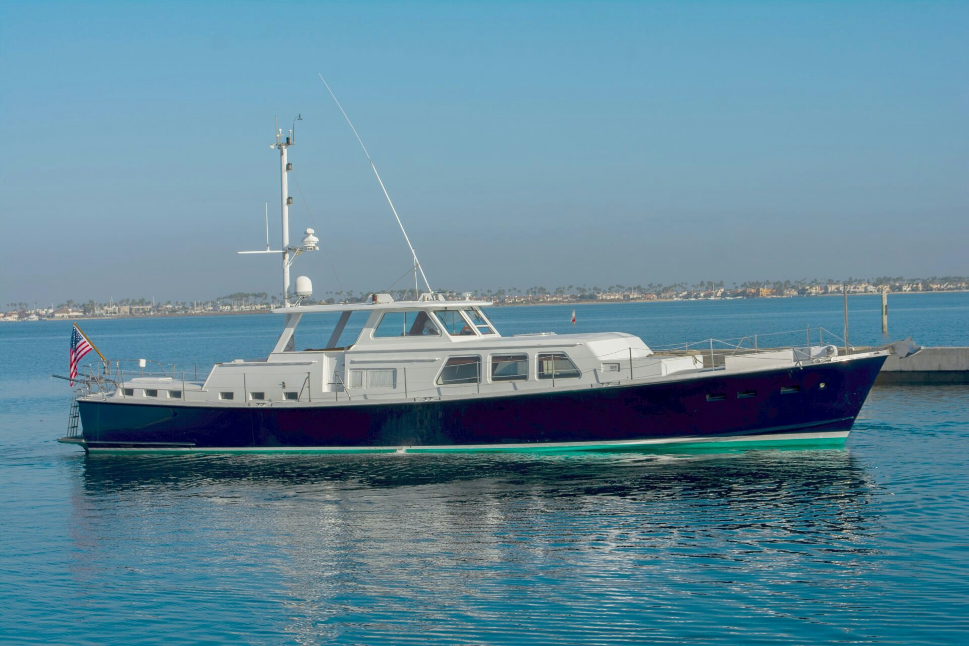 Blending the graceful lines of a Long Island commuter with those of a downeast cruiser, ISLANDER has a traditional profile. Built in 1969 by Lantana, the yacht boasts a dark blue hull and low-profile form that ensure admiring looks wherever she travels.