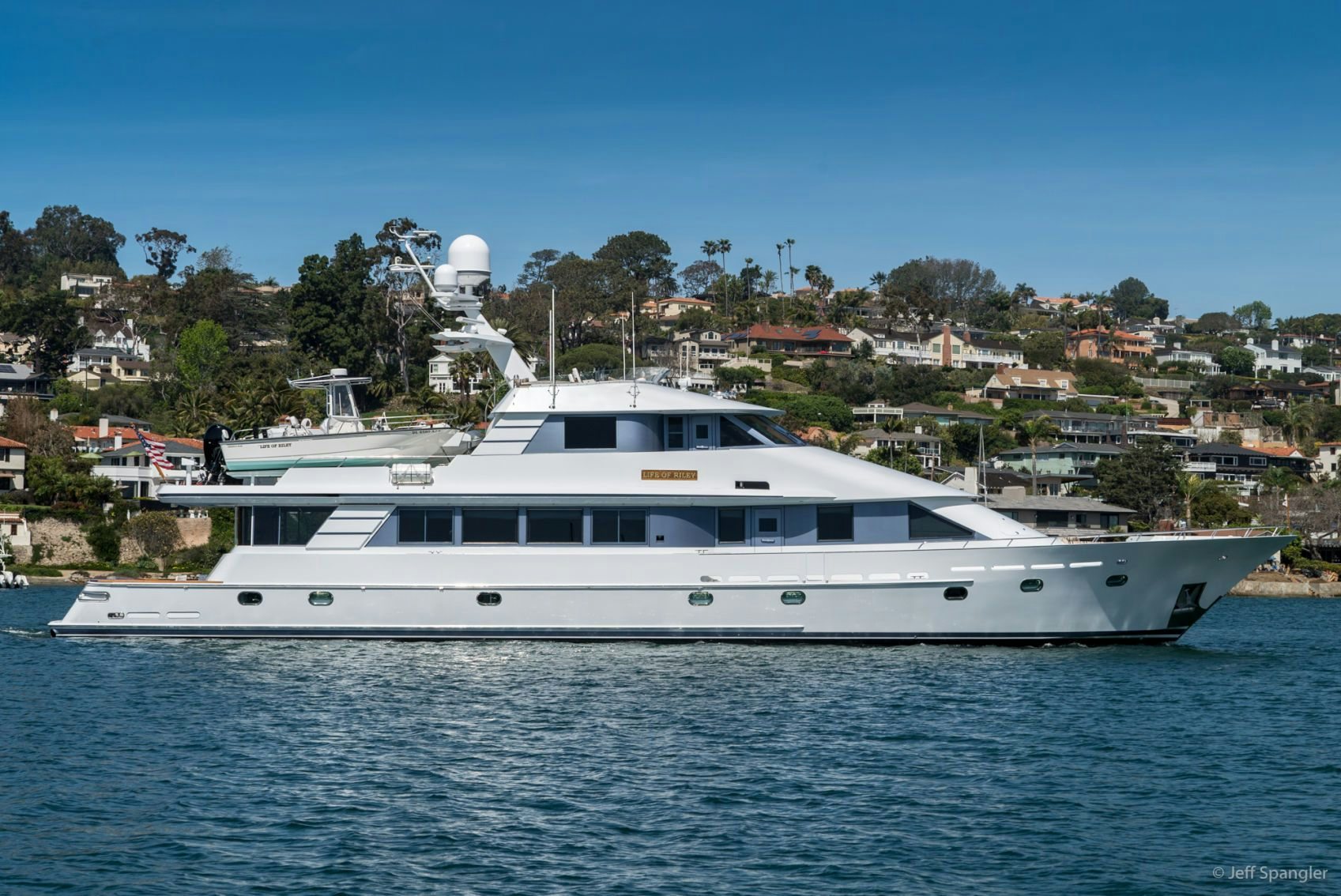 Custom built by Crescent Yachts in 1994, LIFE OF RILEY was designed to offer comfort and safety while long-range cruising. The luxury yacht has a large interior volume with a welcoming ambiance complemented with rich fabrics and wood. The yacht’s enormous windows throughout offer spectacular views of the cruising destination as well as ample natural light.