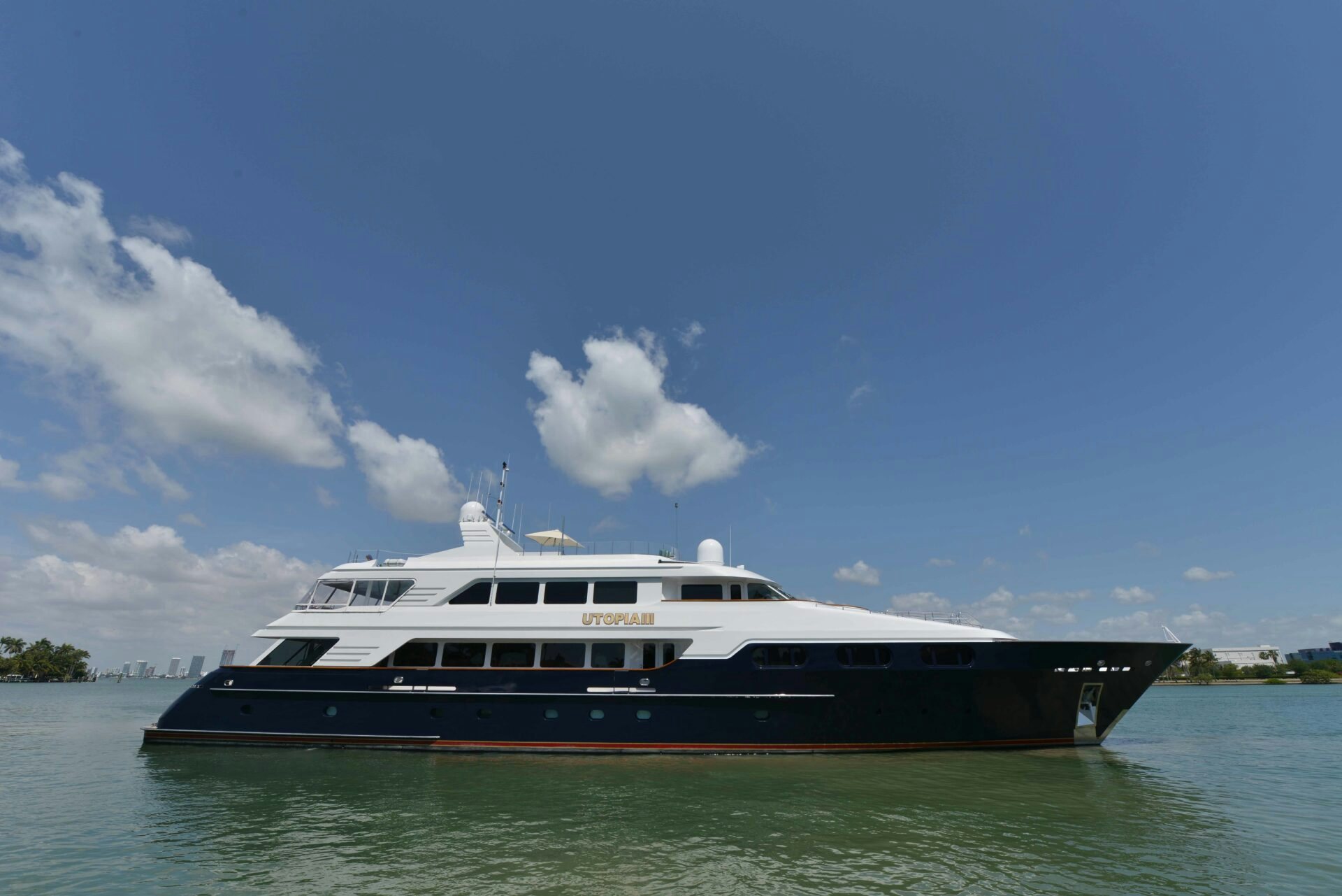UTOPIA III is a tri-deck motor yacht designed for extended long-range cruising in comfort and safety. Her shallow draft is ideal for Bahamas cruising and her power convertor and passarelle is perfect for Mediterranean cruising.