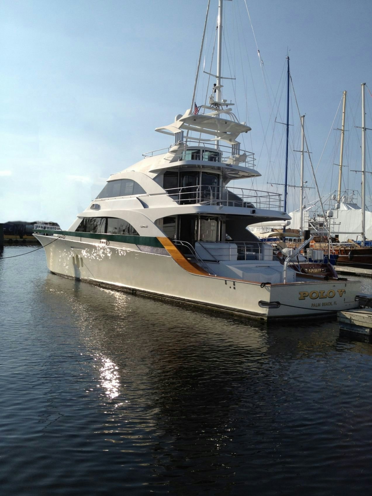 The 32-meter Broward POLO V is an exquisite sport yacht with exterior styling by Luiz DeBasto. The focal point of this vessel is her centerline curved-glass, enclosed spiral staircase that reaches from the main deck through the skylounge to the flybridge. Her hand-rubbed cherry interior is striking and classic. The quality construction and the number of innovations utilized during the build of POLO V are so numerous and noteworthy that the only way to fully appreciate them is to see her first hand.
