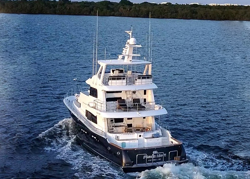 This full-load displacement expedition yacht is ideally suited for sports fishing. She features a long-range format that allows her to cruise extensively around the world in total safety while still offering an impressive level of comfort to all guests. PINCH ME is a stunning yacht with truly striking exterior lines that will attract attention wherever she cruises. The yacht features a 22-foot, four-inch (6.8m) beam and a seven-foot, six-inch (2.2m) draft. PINCH ME is powered by two Detroit Diesel engines that provide her with 740 horsepower each and allow the yacht to cruise at nine knots.