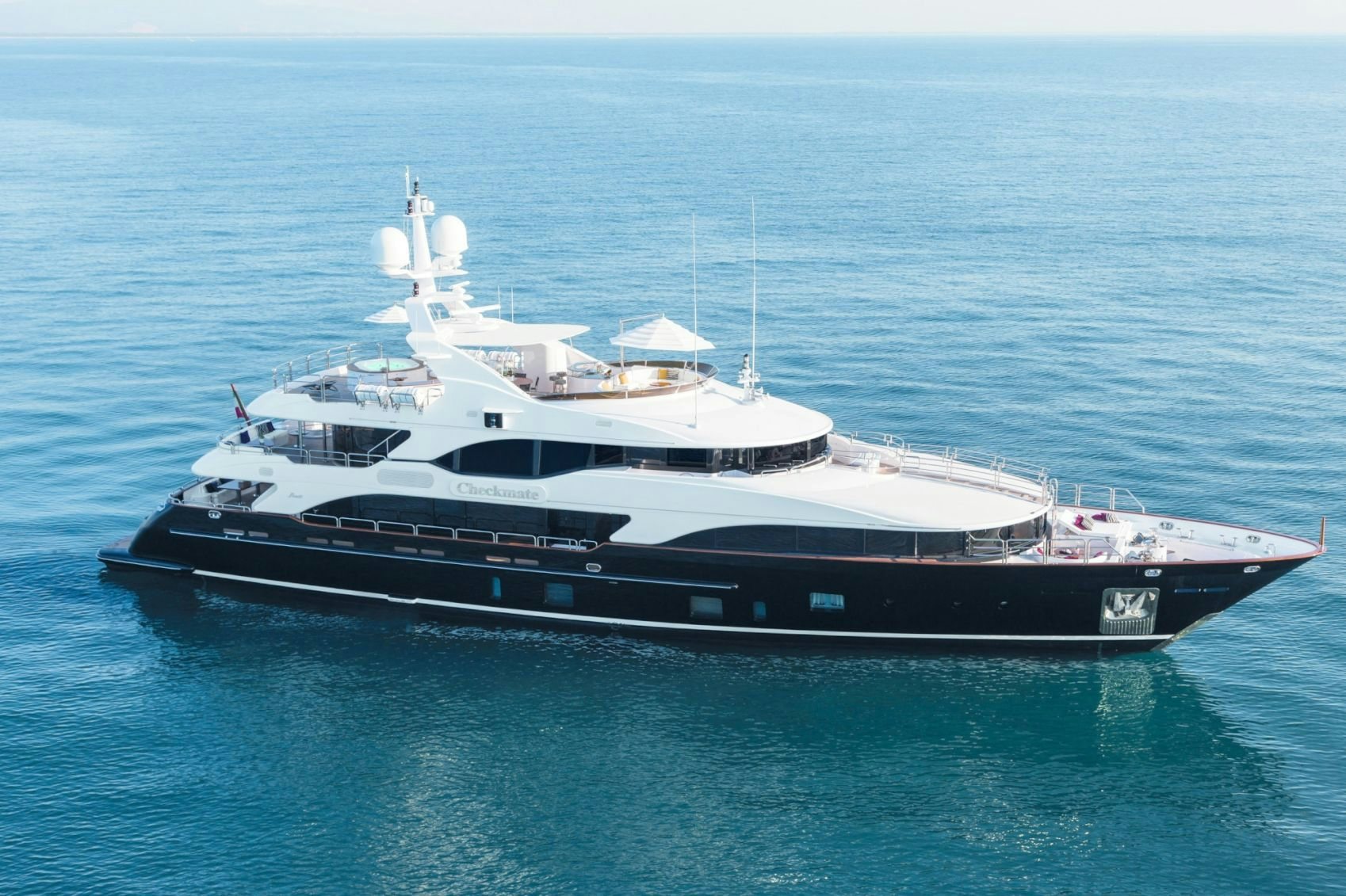 She features an on-deck master suite with 180-degree panoramic views, Zero Speed stabilizers, VSAT Internet access and a spacious sundeck with a day head, among other bespoke assets. CHECKMATE is the first of her series to have large panoramic hull ports and feature a much larger and redesigned skylounge.