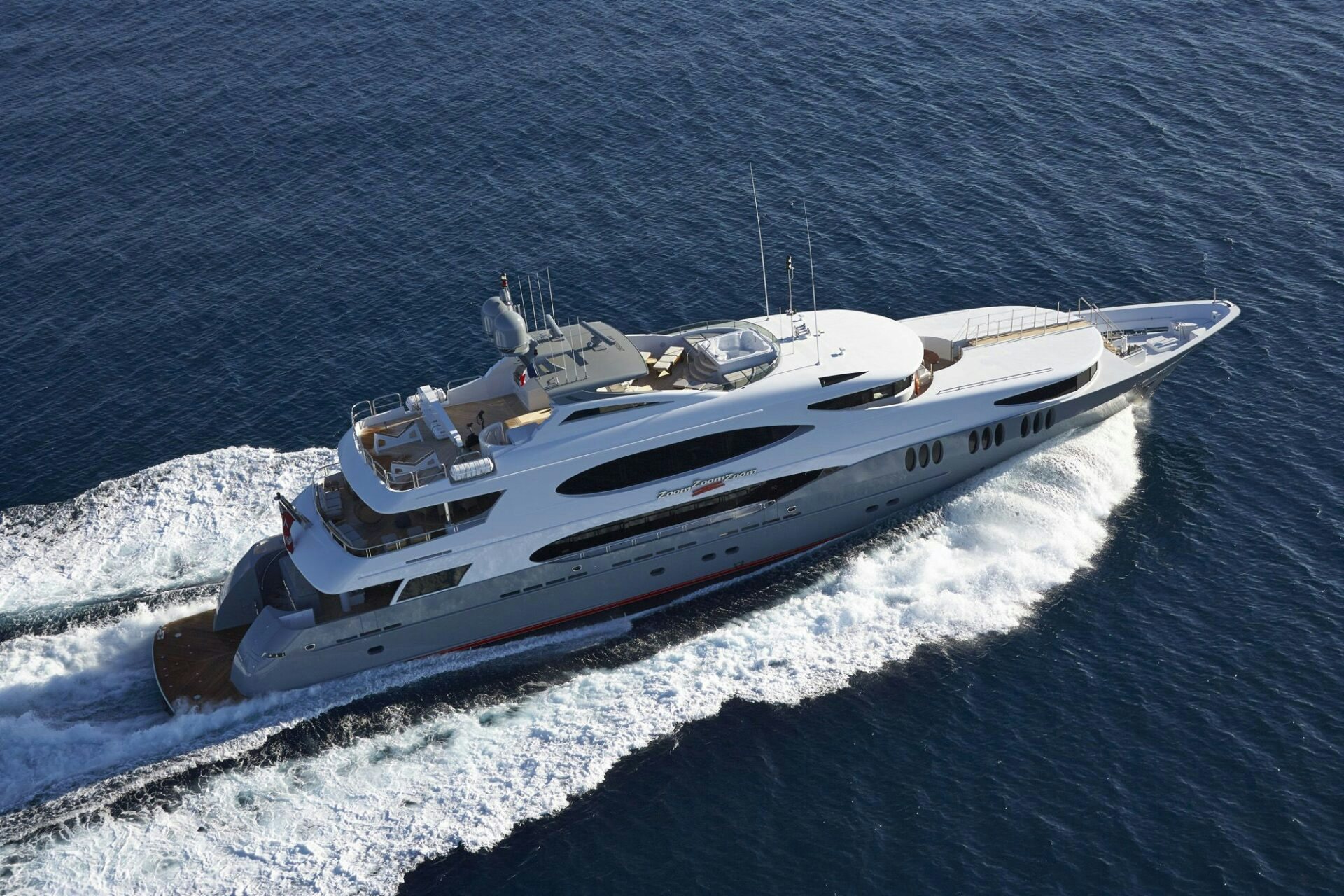 ZOOM ZOOM ZOOM has an extended 14-foot swim platform well suited for launching watersports or waterside alfresco dining. A deck barbecue, gym equipment Jacuzzi and Zero Speed stabilizers further enhance the onboard experience.