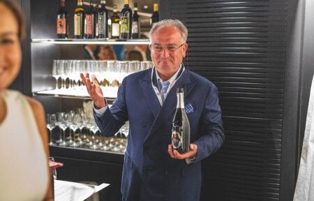 Guests sipped wines from Tuscany by Torciano Wines. The owner of the vineyard, Pierluigi Giachi, was on board with his son, Emanuele, to explain the qualities of these extraordinary wines. There was prosecco, Vernaccia (white wine) served first and then some excellent red wines from Tuscany: Terrestre, Bartolomeo and Brunello di Montalcino, to name a few. Chai Rum served delicious cocktails on the flydeck as Kiran Akal, the rum’s creator, shared insights and recipes.