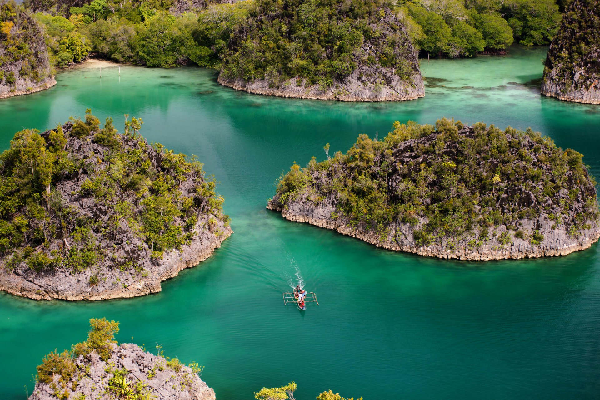 In the morning, set sail for Wayag Island with its astoundingly clear lagoon and rising castles of jungled limestone cliffs.