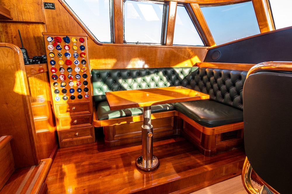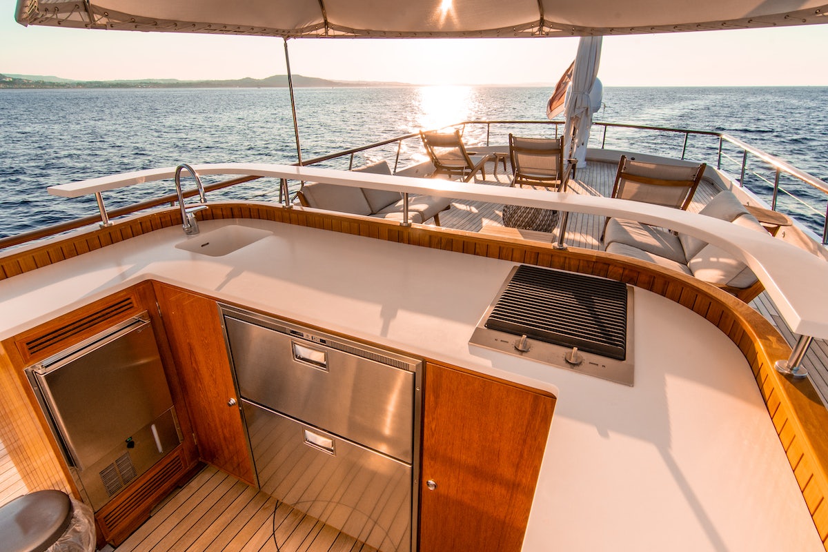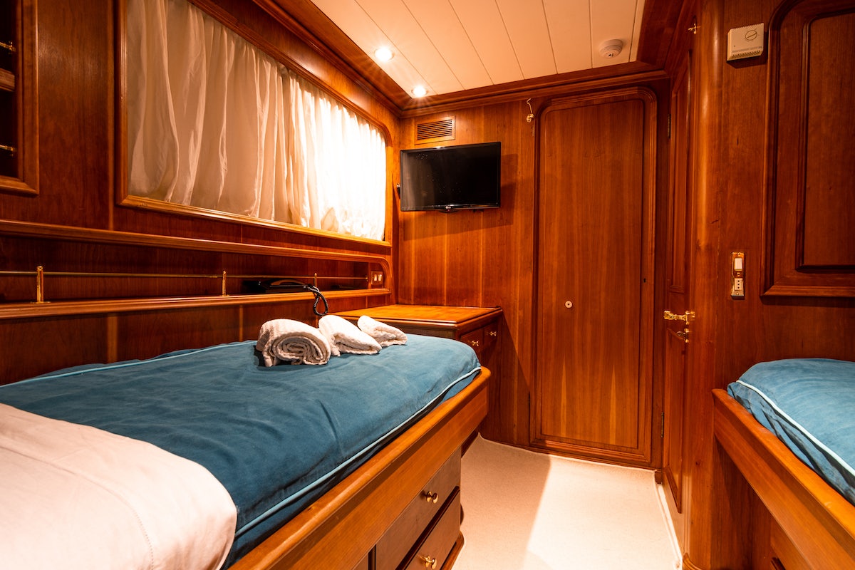 Charter yacht A&A welcomes 10 guests to enjoy her five well-appointed staterooms. The spacious master suite on the main deck is saturated in beautiful wood paneling to create a warm ambiance. Additional accommodations include a VIP suite, two twins and a children’s cabin with bunk beds. Each of A&A’s guest cabins is equipped with entertainment centers and en-suite bathrooms that showcase a classic design. Four crewmembers can be accommodated onboard A&A.