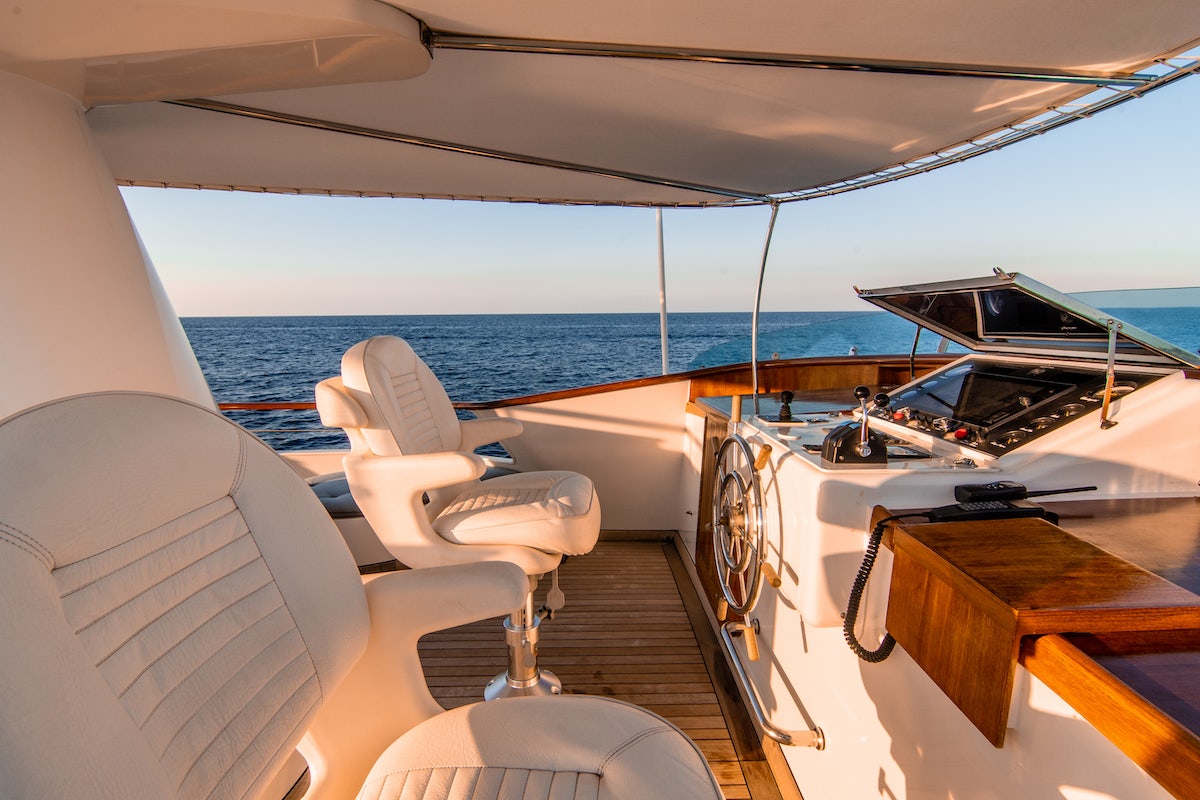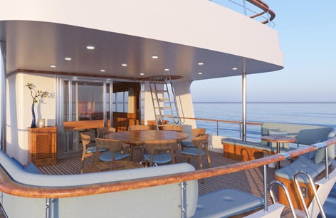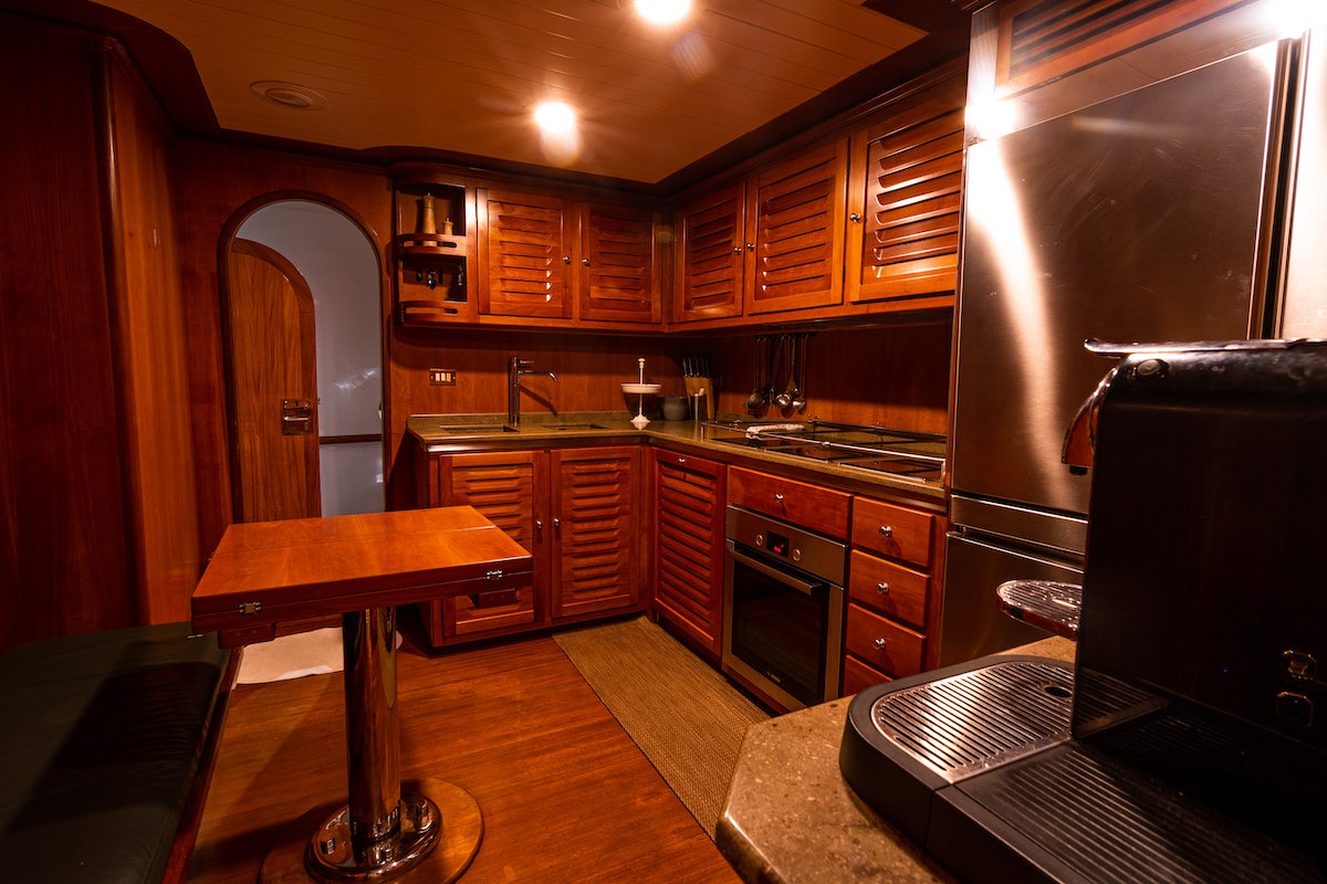 The yacht’s main salon is traditional and stylish, featuring décor by Studio Massari with seating on two comfortable L-shaped sofas, a bar and a complete entertainment center. Large, continuous windows bring light to the salon. The interior wooden panels and overall decoration create a welcoming atmosphere. The formal dining area is situated forward for guests to socialize and enjoy meals together.