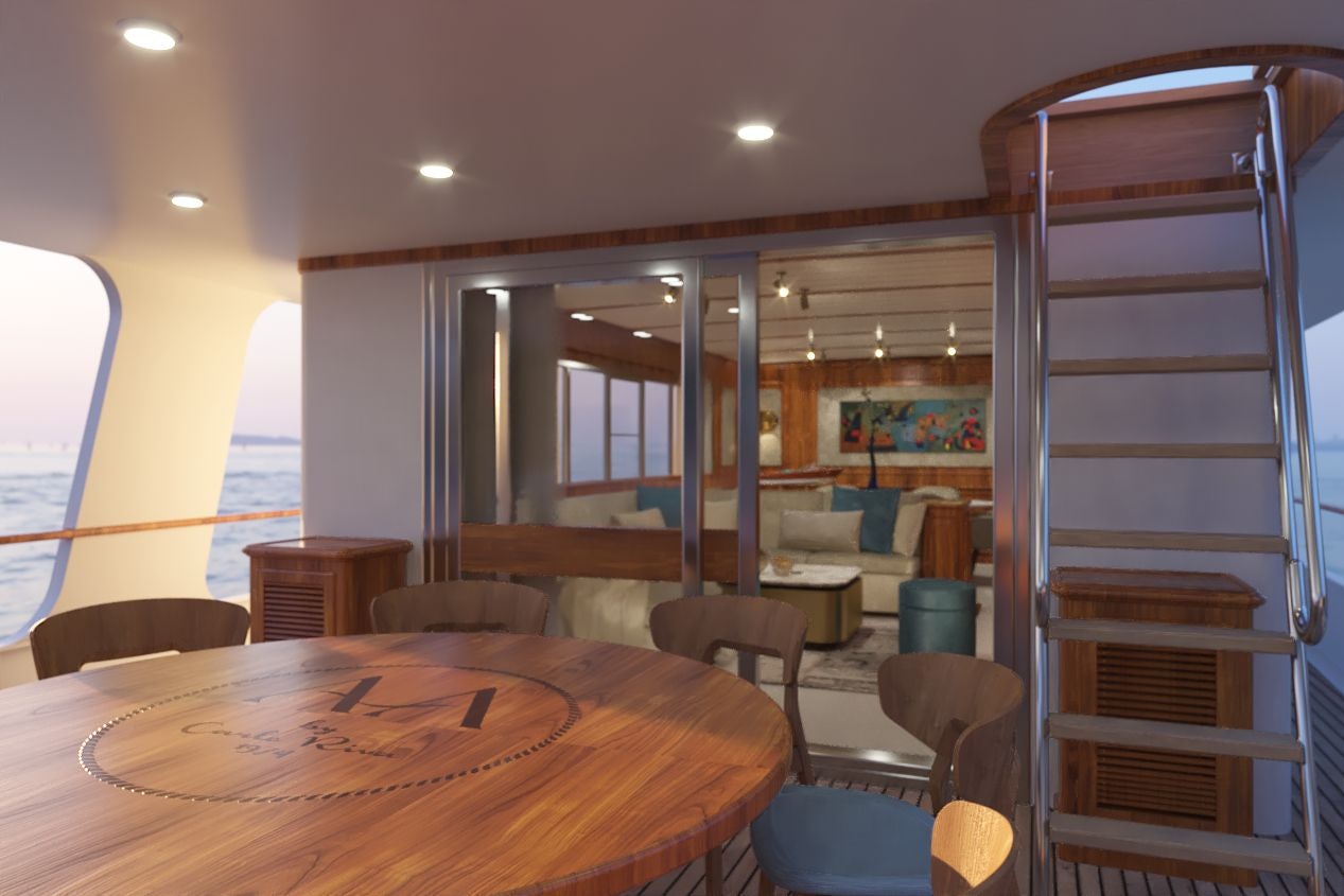 A&A’s exterior showcases an open space on the flybridge with a bar, a cozy sofa and plenty of sunbeds. Forward is a large area filled with sunpads for guests to layout and admire the views. The sheltered aft deck offers an exterior dining table for guests who prefer to dine alfresco. A&A was built with modern features and entertainment facilities, perfect for relaxed cruises in style ideal for family charters.