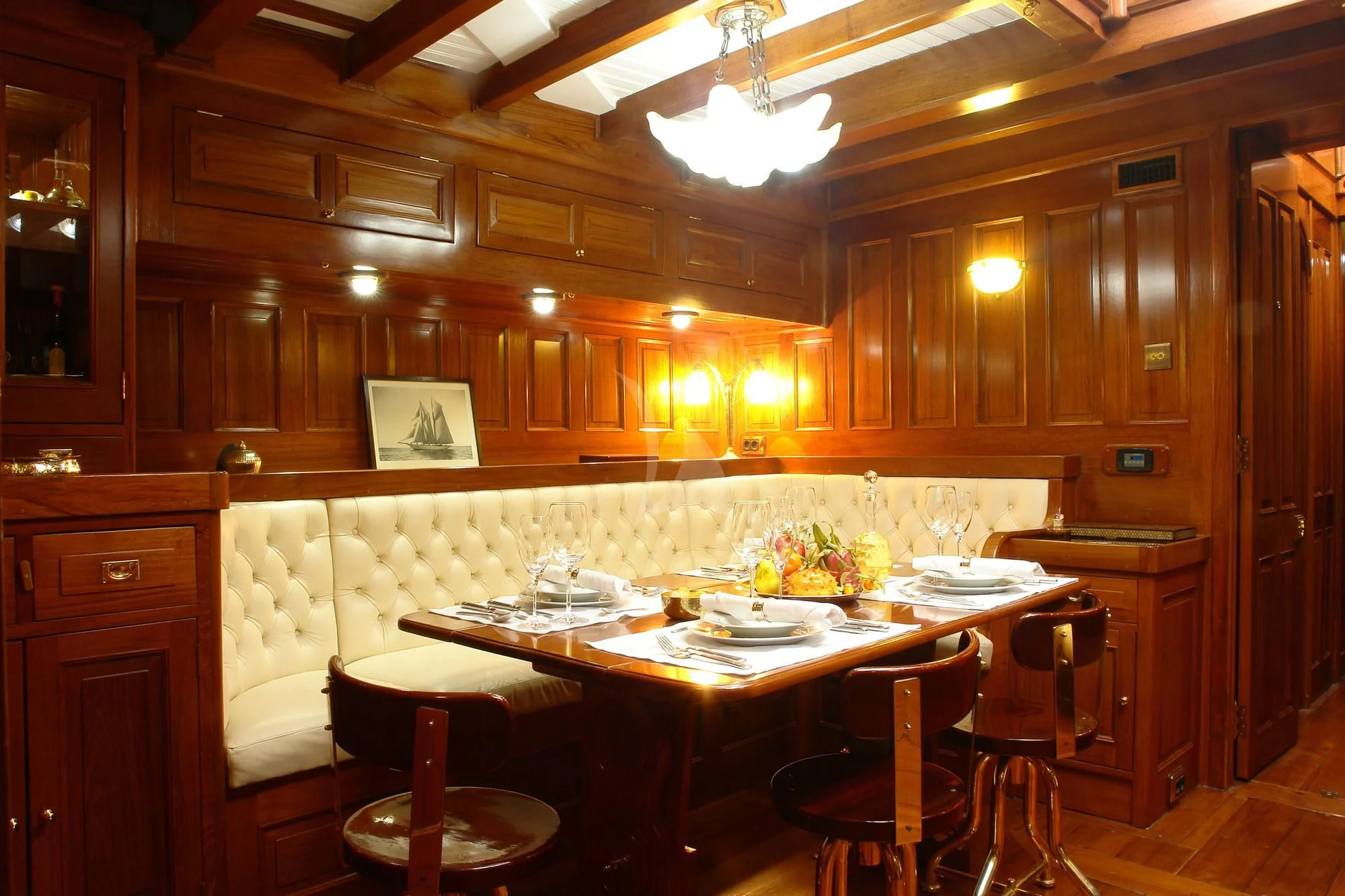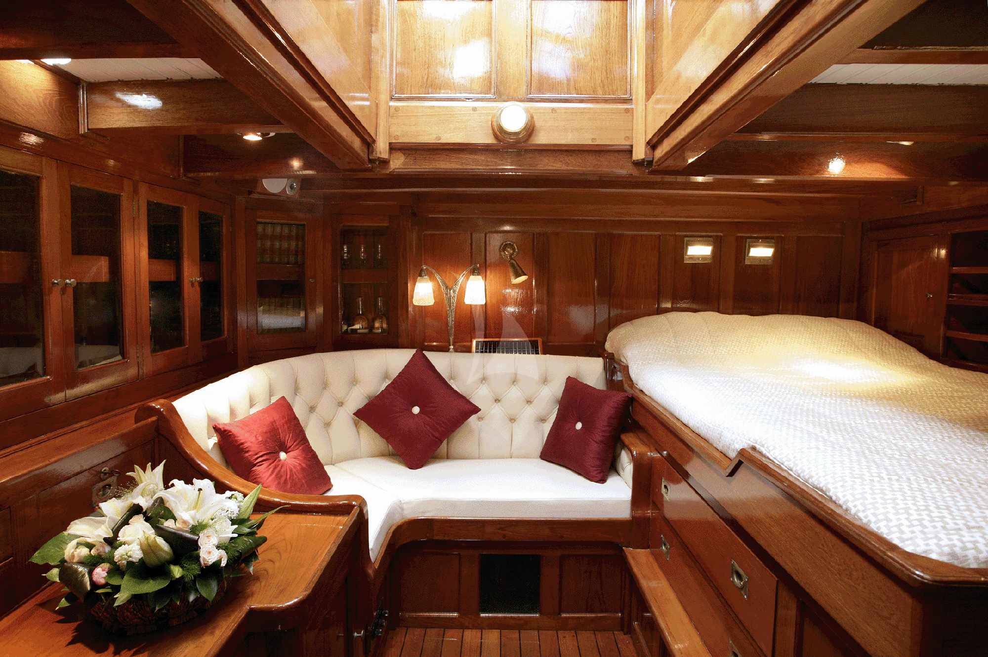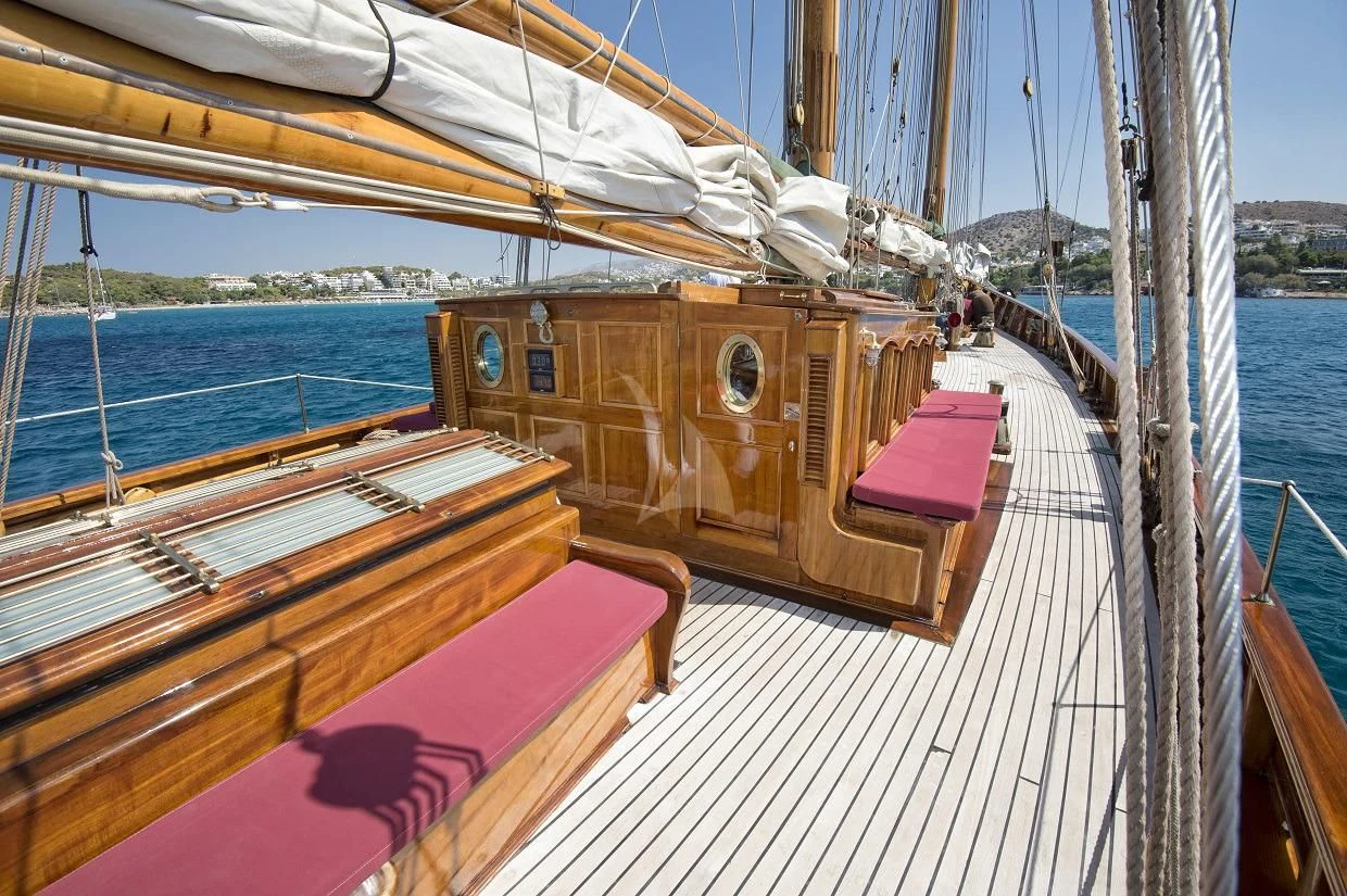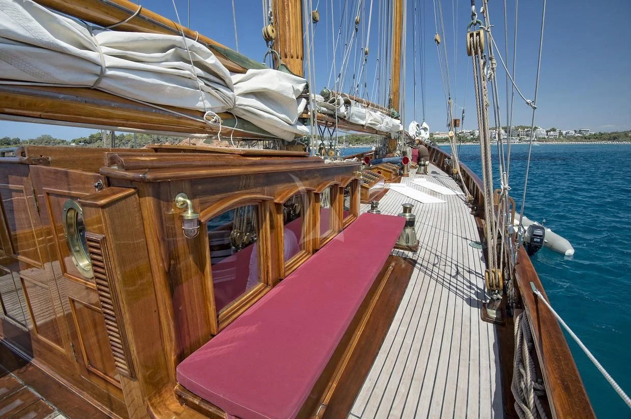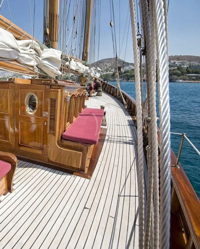 This rare and luxurious sailing schooner was entirely refitted with Burma teak, an exceptionally rare and beautiful wood, which adds to her uniqueness. Even this wood has a history of its own, as it was salvaged from a vessel that sank in 1917 that was carrying a cargo of Burnese teak. Unique and full of charm, charter yacht ALLEO's main salon is classic and elegant with a formal dining area and comfortable seating area with 42-inch flat-screen TV. On deck, guests can enjoy an alfresco meal created by the onboard chef, plus there is plenty of deck space for sunbathing and relaxing while enjoying a cocktail from the bar. Luxury sailing yacht AELLO is equipped with snorkeling and fishing equipment for guests to enjoy while at anchor.