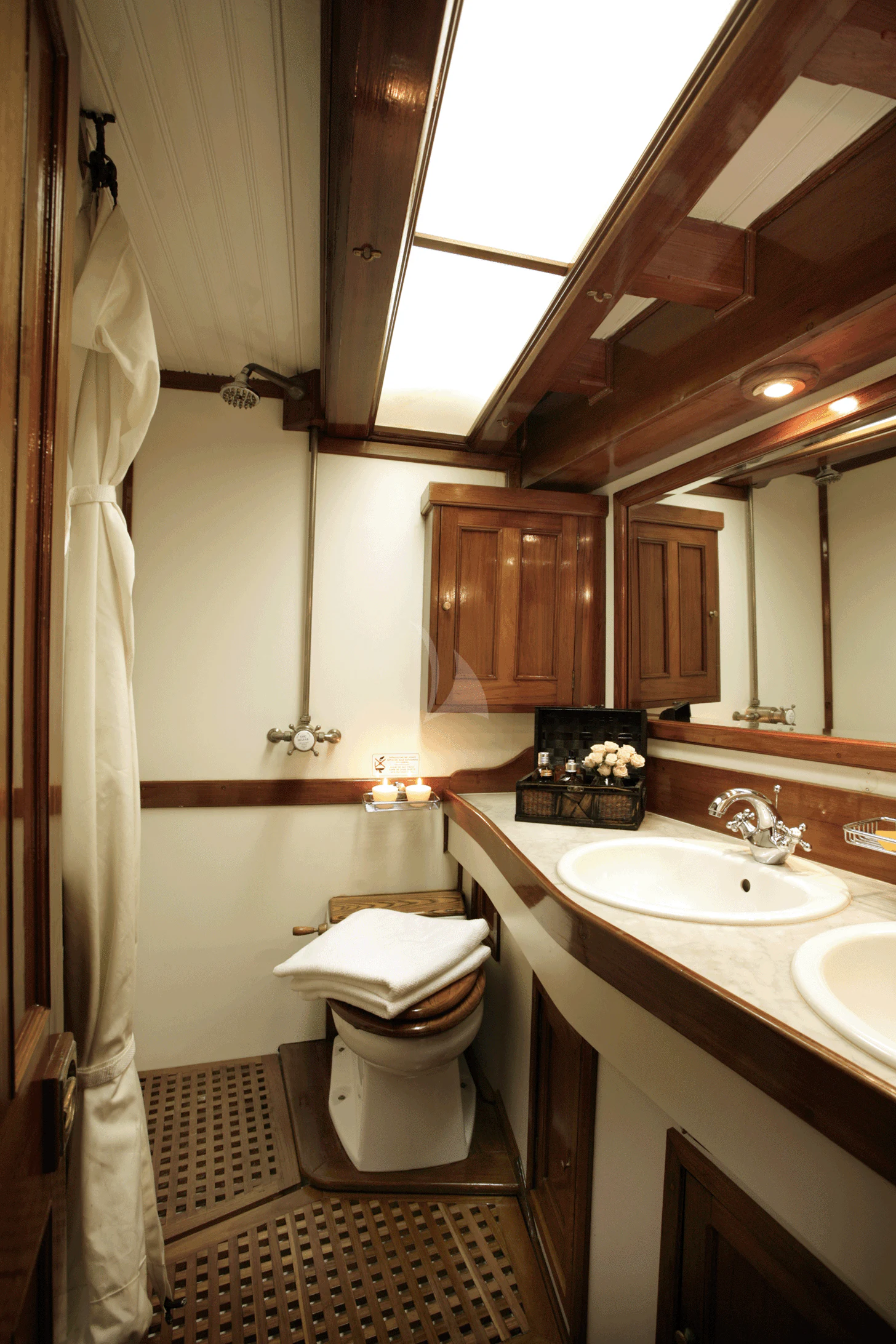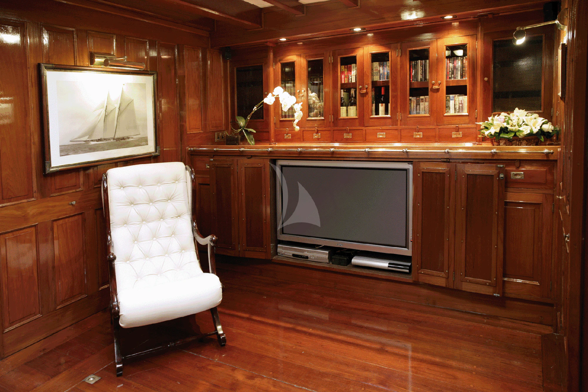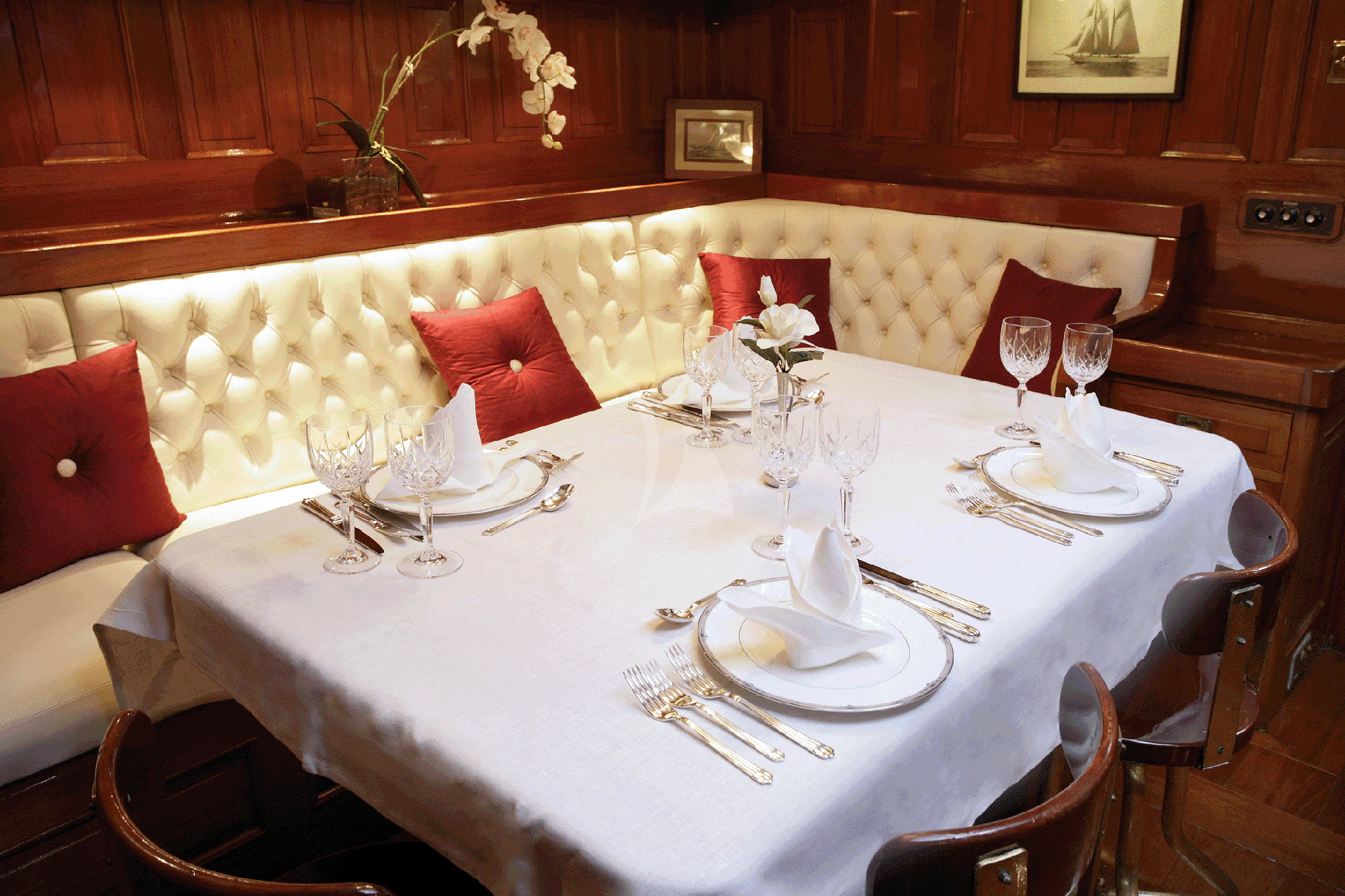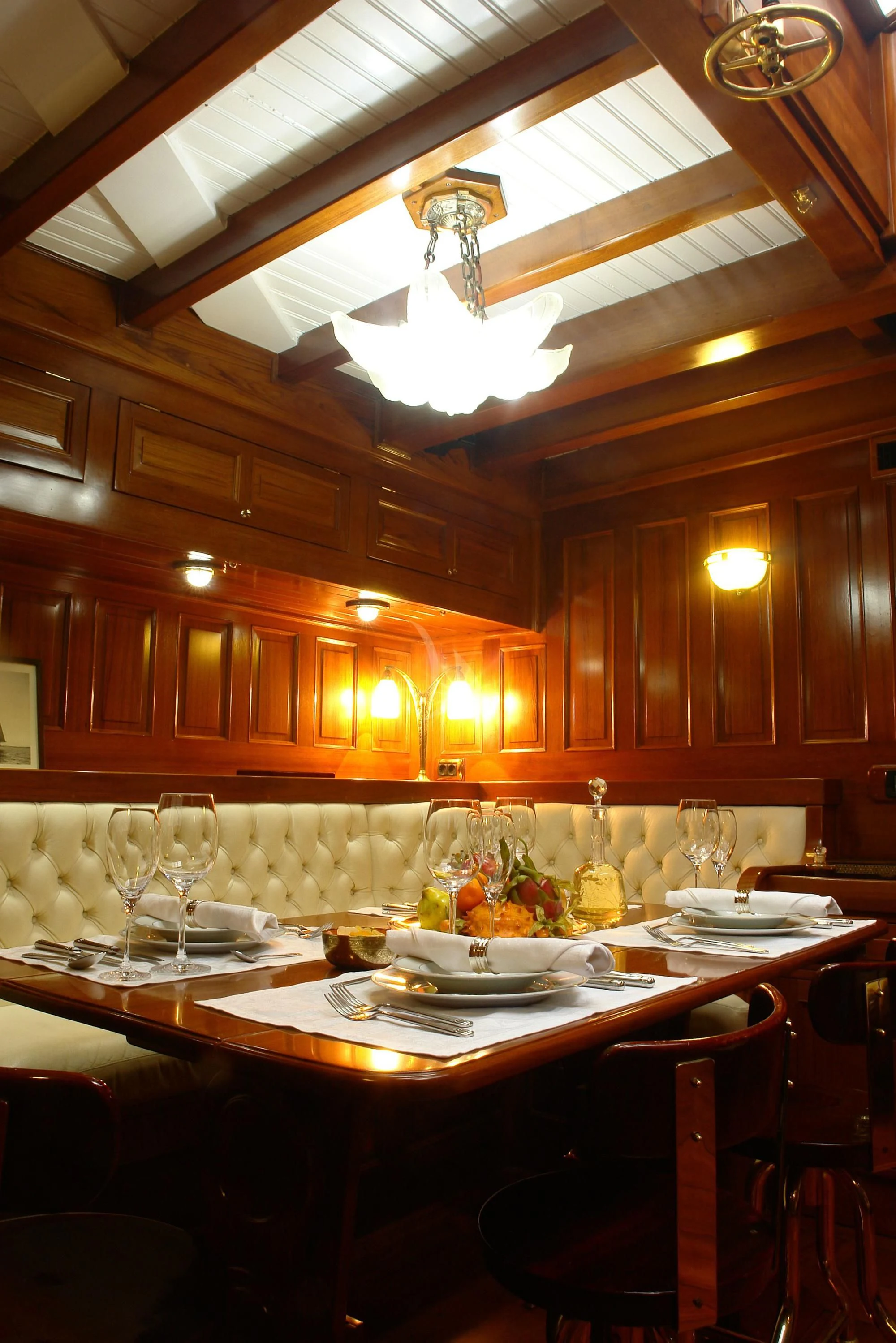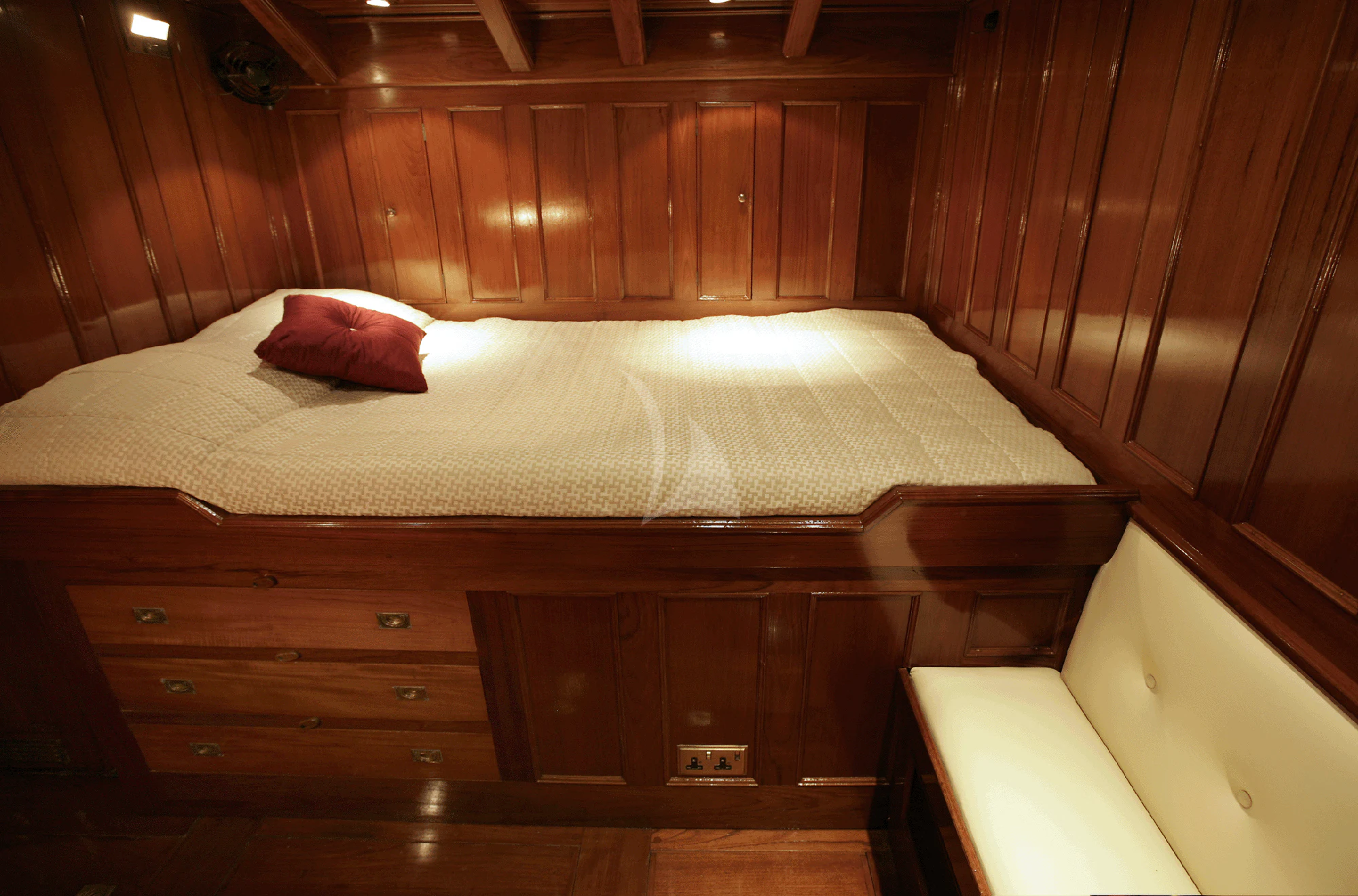 This rare and luxurious sailing schooner was entirely refitted with Burma teak, an exceptionally rare and beautiful wood, which adds to her uniqueness. Even this wood has a history of its own, as it was salvaged from a vessel that sank in 1917 that was carrying a cargo of Burnese teak. Unique and full of charm, charter yacht ALLEO's main salon is classic and elegant with a formal dining area and comfortable seating area with 42-inch flat-screen TV. On deck, guests can enjoy an alfresco meal created by the onboard chef, plus there is plenty of deck space for sunbathing and relaxing while enjoying a cocktail from the bar. Luxury sailing yacht AELLO is equipped with snorkeling and fishing equipment for guests to enjoy while at anchor.