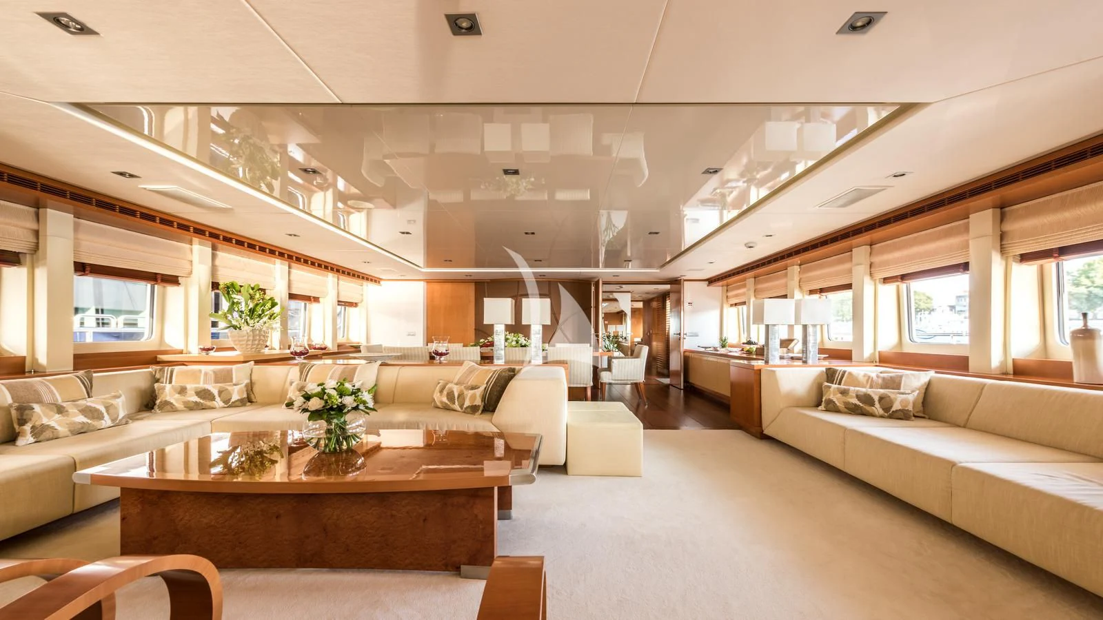 When you step aboard AGRAM, you’ll instantly notice the attention to detail that’s gone into her interior design. AGRAM boasts an elegant and modern decor inspired by Omega Architects and Heesen, with timber paneling and floors, as well as beige and cream furnishings. Her spacious main salons’ large wrap-around windows offer guests fantastic views of her cruising grounds and are the perfect space for socializing. Her accommodations include a full-beam master stateroom offering guests an office, walk-in wardrobe and Jacuzzi tub on her main deck, as well as two double and two twin staterooms on her main deck, all paired with en-suite facilities. Her skylounge converts into an extra double stateroom, only adding to her appeal.