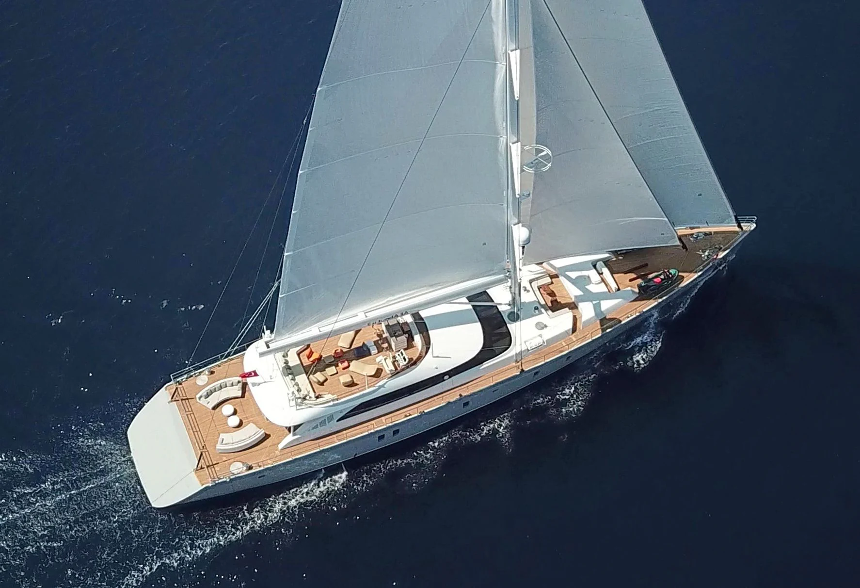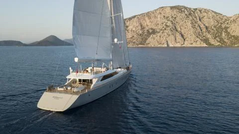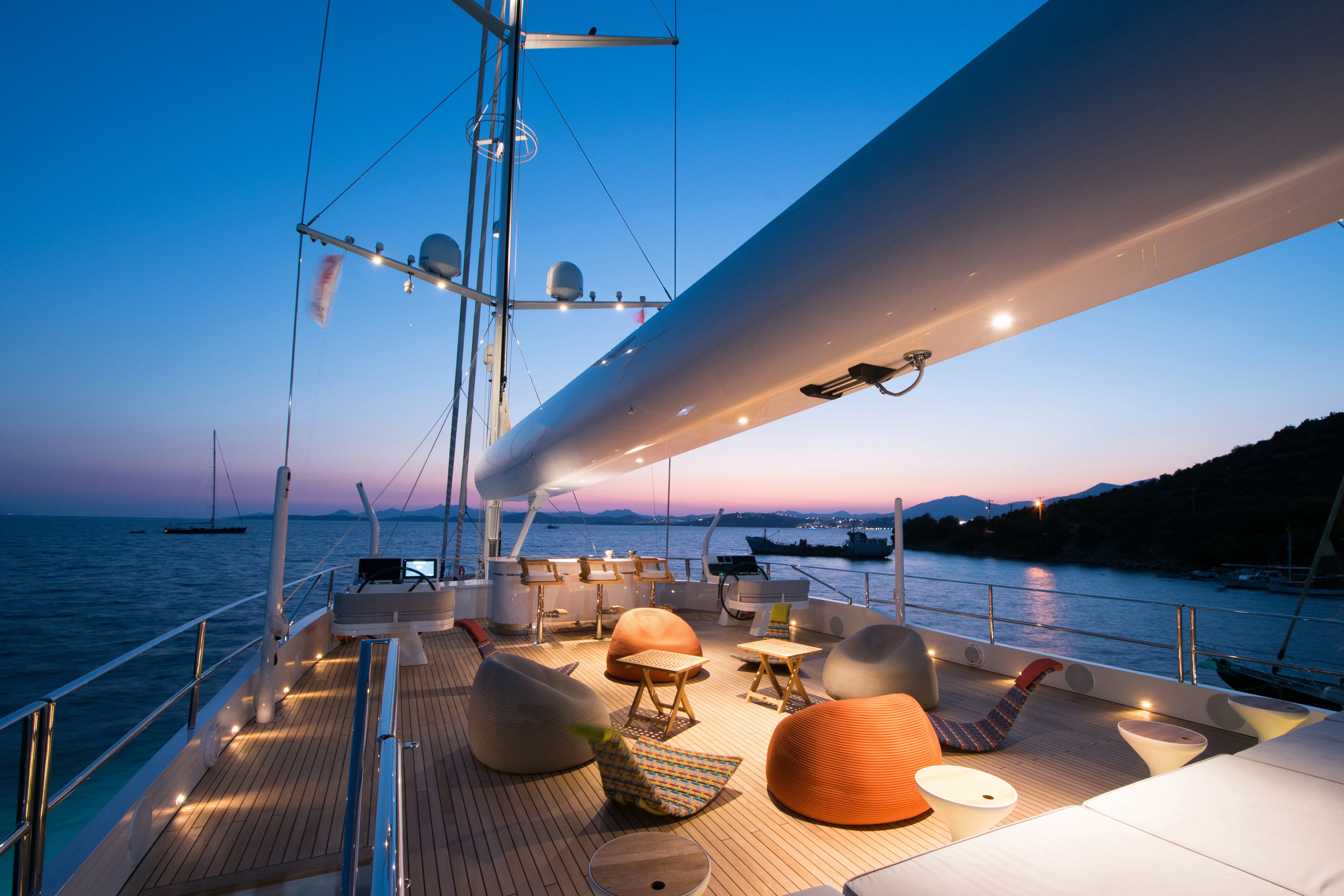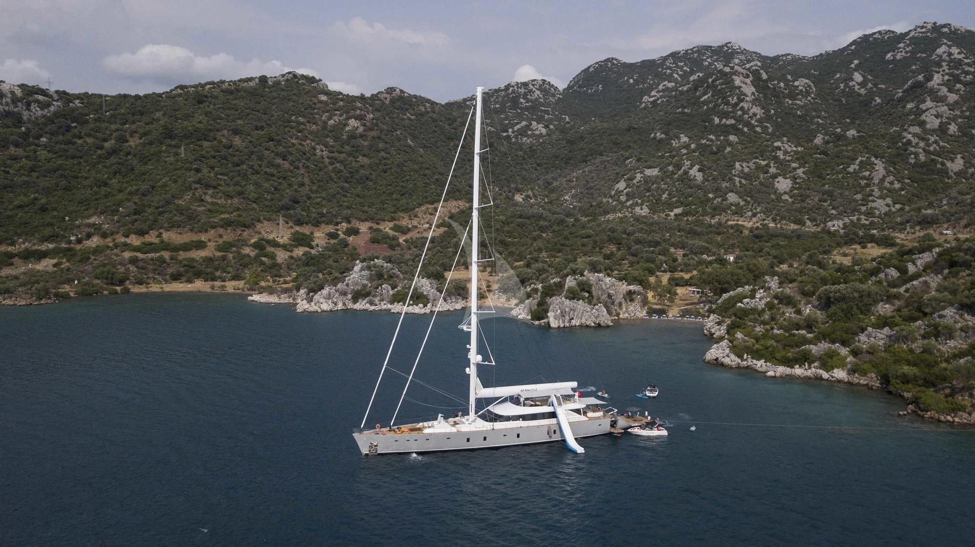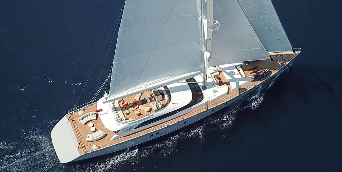 ALL ABOUT U 2 has an aluminum superstructure and a steel hull. She is designed to offer guests a superior sailing performance on the open seas, and her charters in the Mediterranean enable her to show off her cruising capabilities. Powered by twin Caterpillar engines, she cruises at 12 knots as she escorts guests along the Turkish coastlines. She has a top speed of 16 knots. ALL ABOUT U 2 is staffed by an expert crew of 10. This talented team creates compelling itineraries and ensures every detail of a charter is exceptional. The six private staterooms comprise a master, a VIP and four doubles. The master is full-beam and incorporates a dressing room.