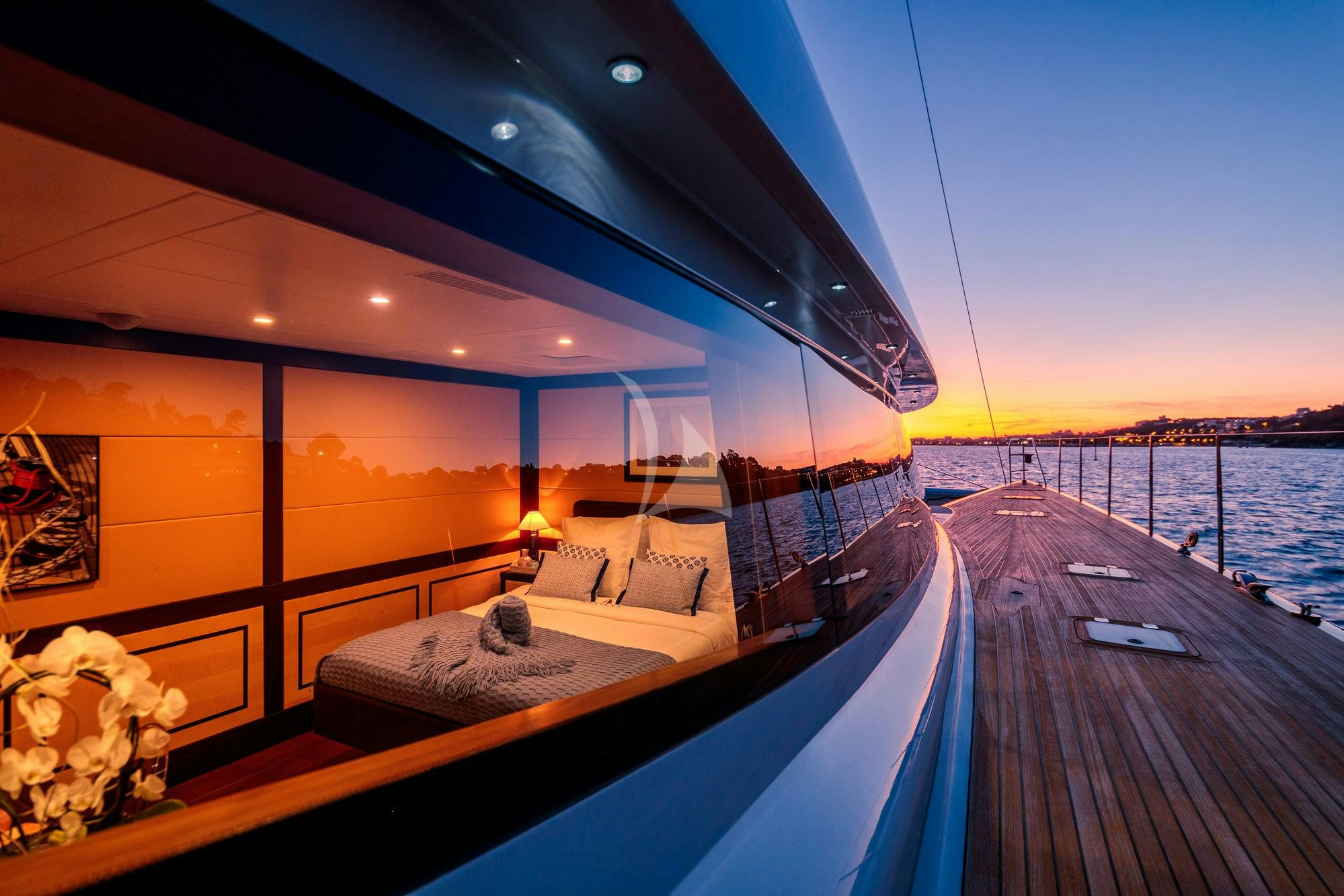 ALLURES is the custom project of a demanding and passionate owner who aimed to build an elegant yacht offering the perfect balance of high-performance sailing and total comfort for guests. ALLURES frequently sails at 15 knots and sometimes faster. The beautiful luxury yacht features an exceptionally styled hull with modern lines well integrated with her interior volume. ALLURES is superb, elegant and refined. This catamaran is sporty yet straightforward to sail and represents the ideal means of living in harmony with the sea, while fully enjoying the luxury and comfort of an outstanding catamaran. ALLURES features vast decks and generous social areas for luxurious live-aboard comfort for up to eight charter guests. Guests can enjoy relaxing undercover on the aft main deck, on the flybridge’s sumptuous settees or aft on sunpads. Nets between the pontoons up front allow guests to be as close to the water as possible. Fully retractable daggerboards allow access to very shallow anchorages and provide the ultimate in safety and performance.