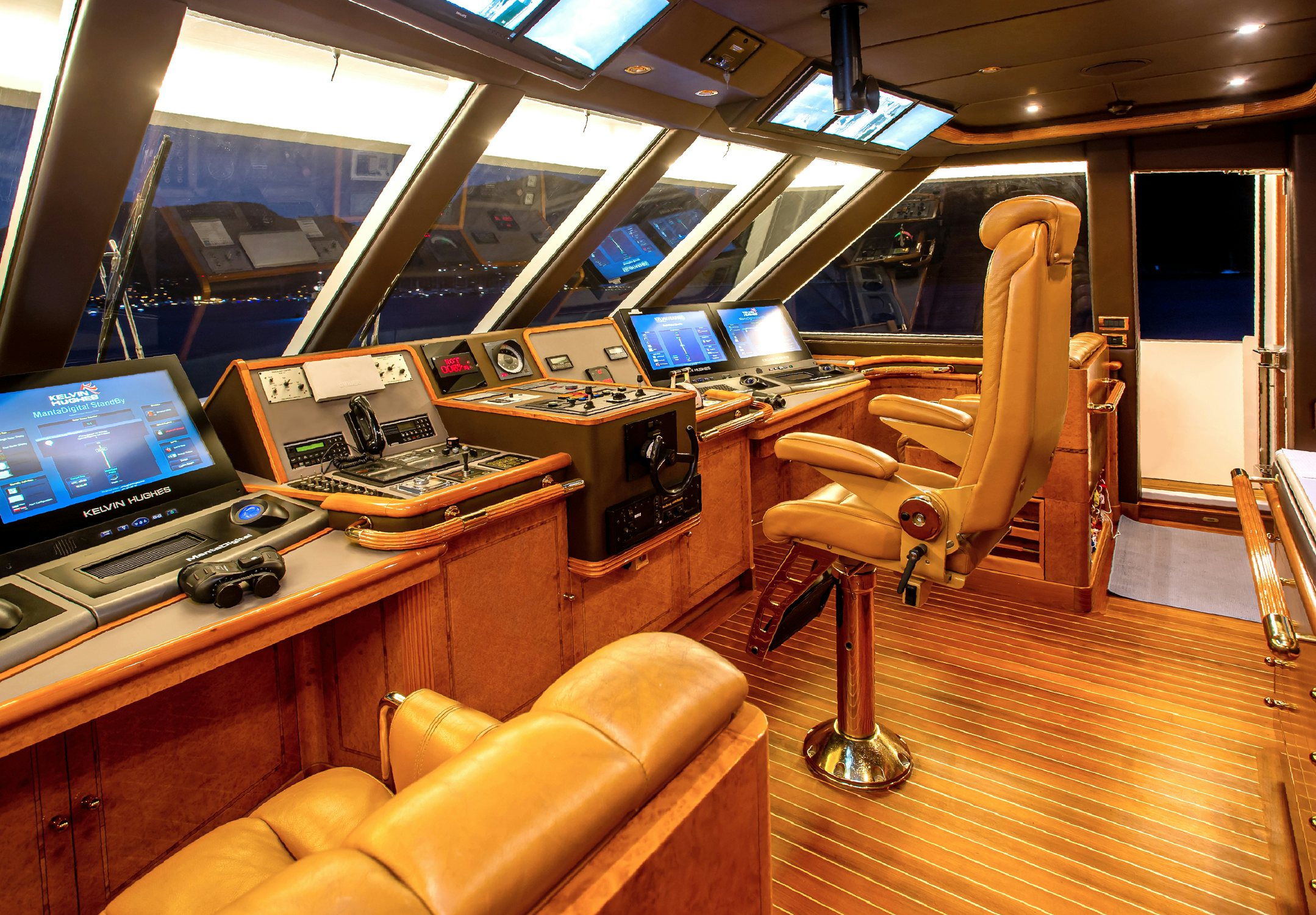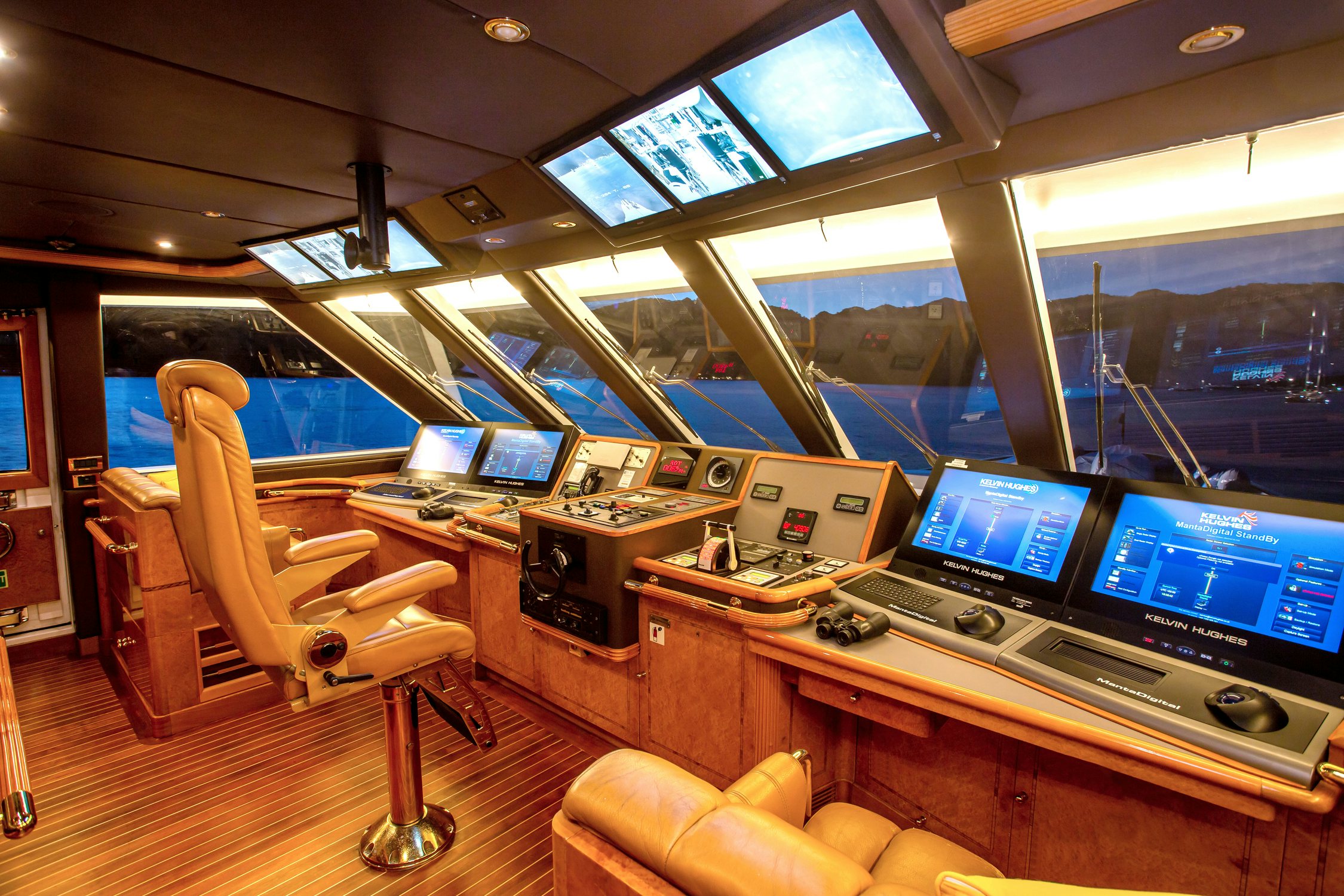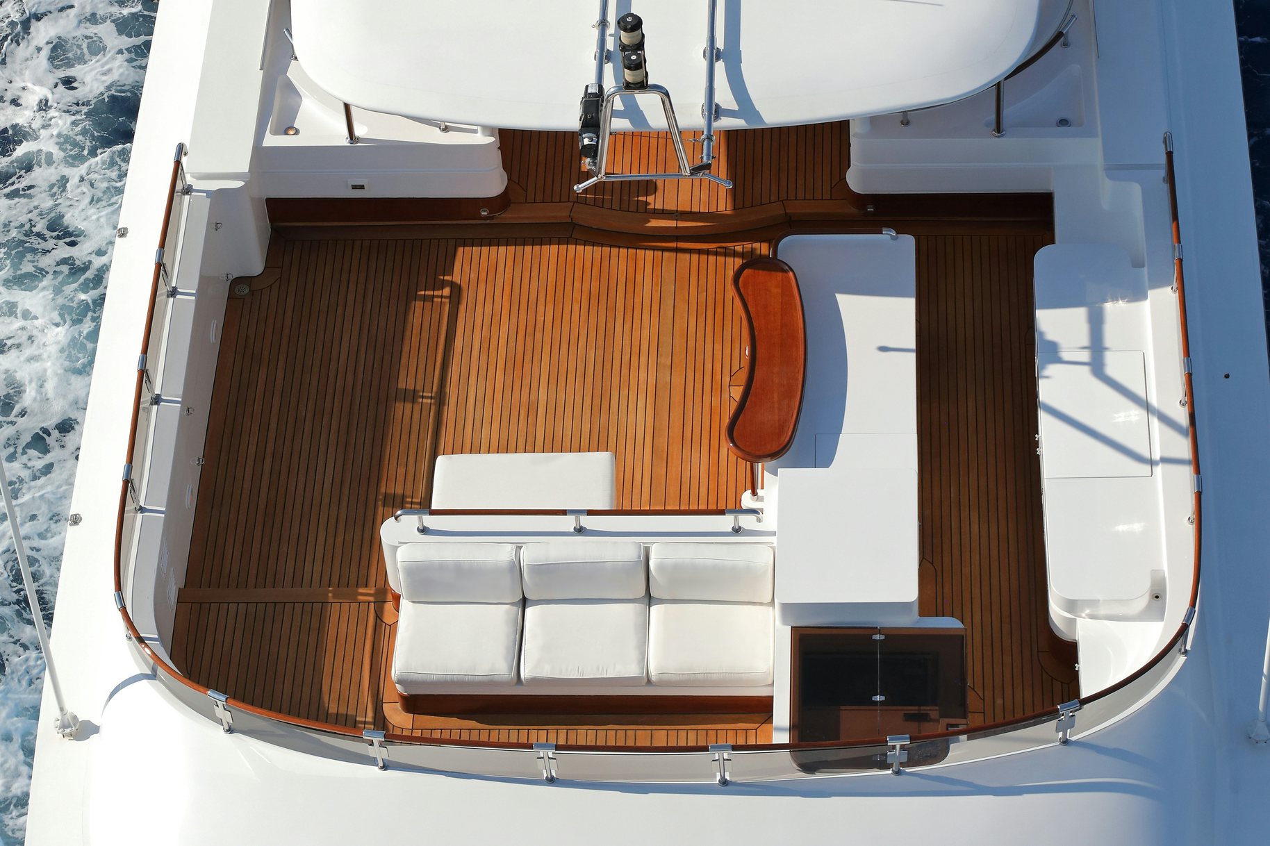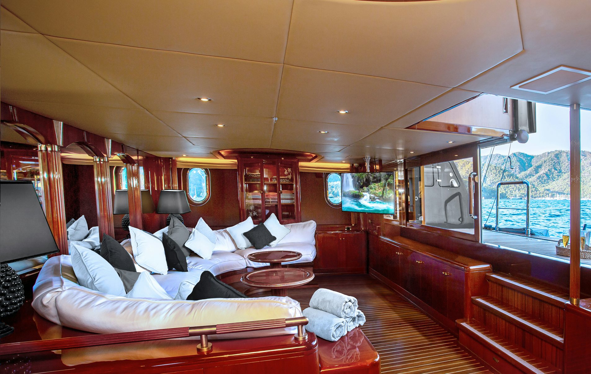 Upon ascending to the main deck aft, guests are overwhelmed by the impeccable ambiance. Through the giant, sliding glass doors of the main deck, AQUA MARE invites patrons into her spectacular interior, meticulously designed by the renowned Francois Zuretti. Alongside the main salon, AQUA MARE offers a well-lit, intimate office for guests needing to work or relax in private while a sea. On the bridge deck, AQUA MARE offers the pinnacle of alfresco dining, providing commodious seating around the massive formal dining table that accommodates all 16 individuals. The central, large U-shaped sofa here also provides spectacular views of the water.