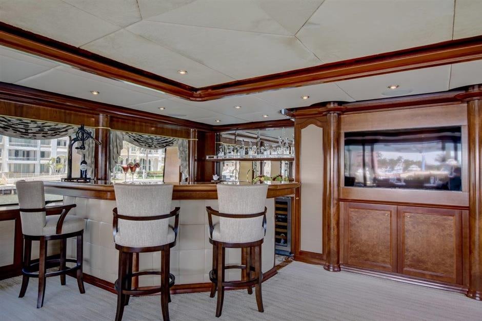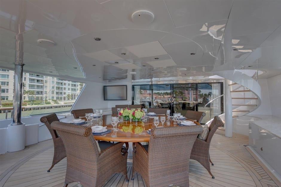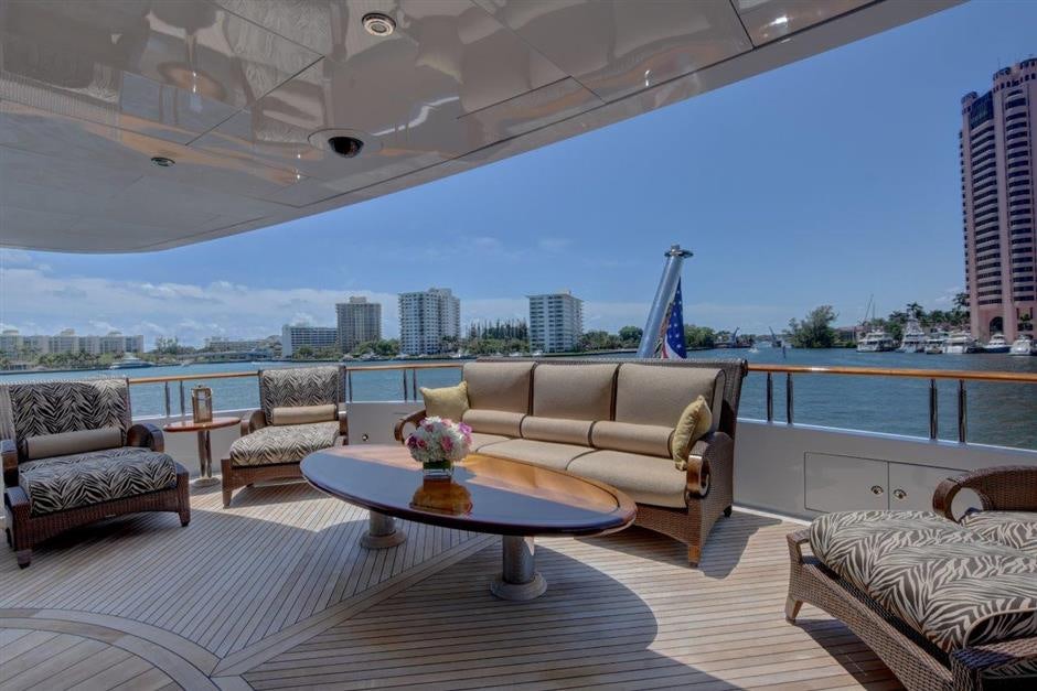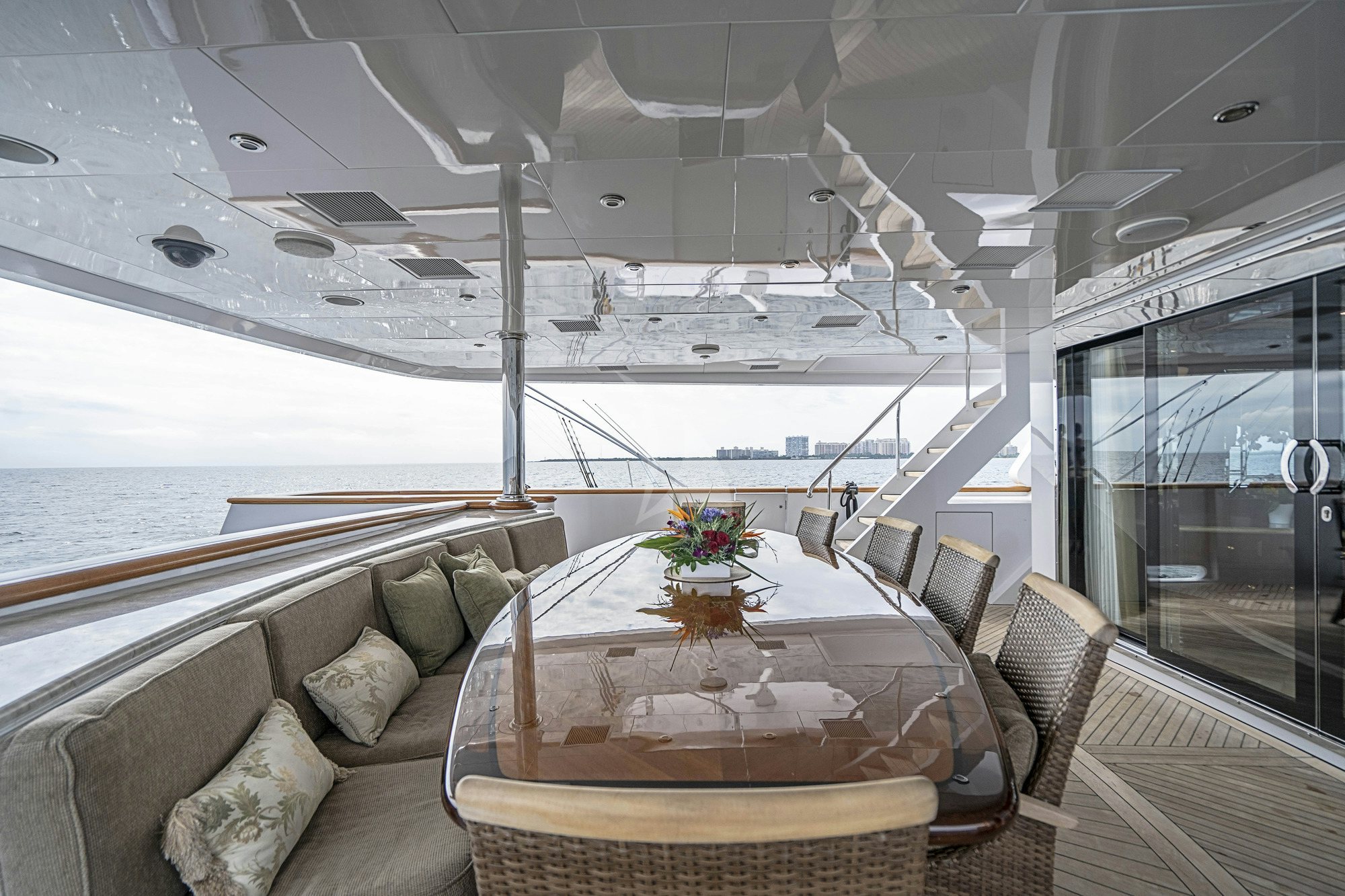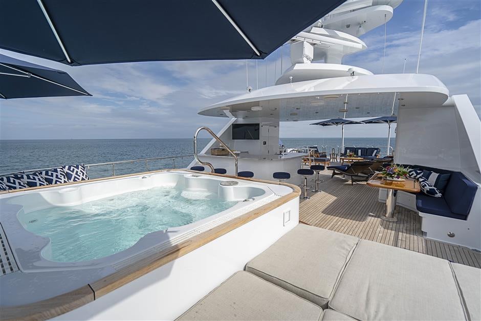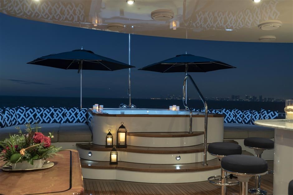 With her head-turning exteriors, AQUASITION offers an abundance of options for entertaining and relaxing outdoors. The flybridge sun deck was specially reconfigured with charter guests in mind. There is a large Jacuzzi, sun loungers, a bar and a lounging area for relaxation and entertaining. The upper deck is a brilliant place for al fresco dining and relaxing, while aft on the main deck also has a large table for dining and comfortable seating to curl up with a book during the day or for after-dinner drinks. There is also access to the expansive swim platform and AQUASITION’s plethora of water sports toys including two Wave Runners and a 32-foot Intrepid tender.