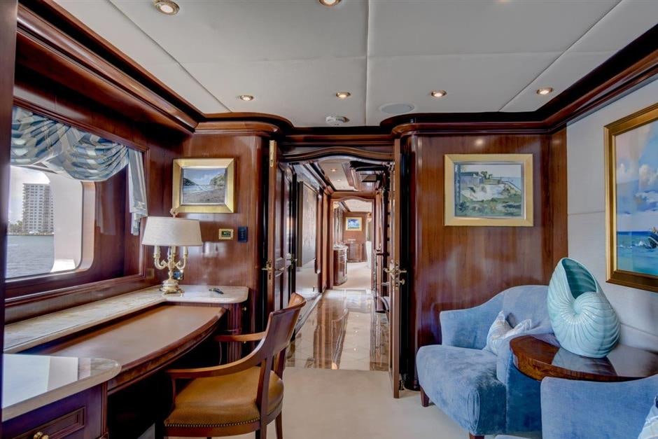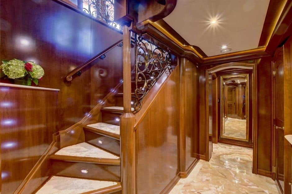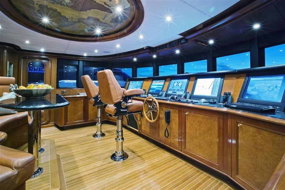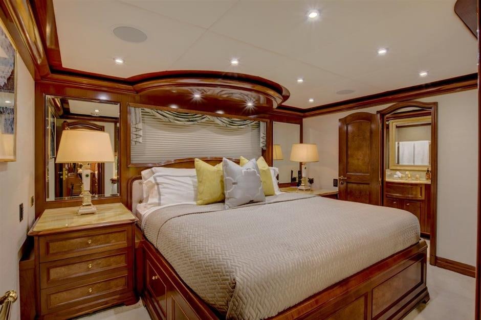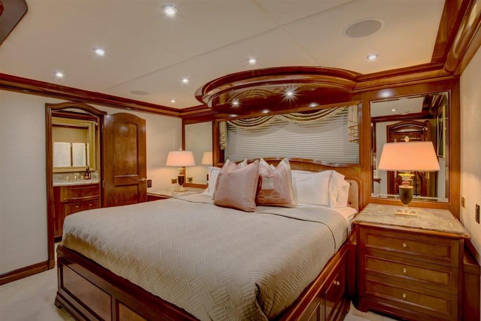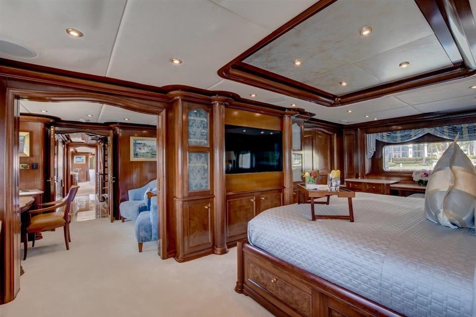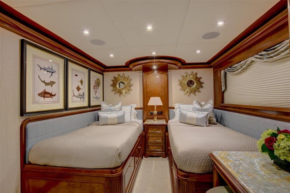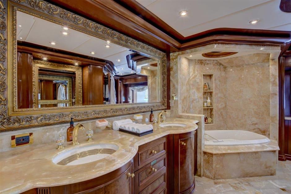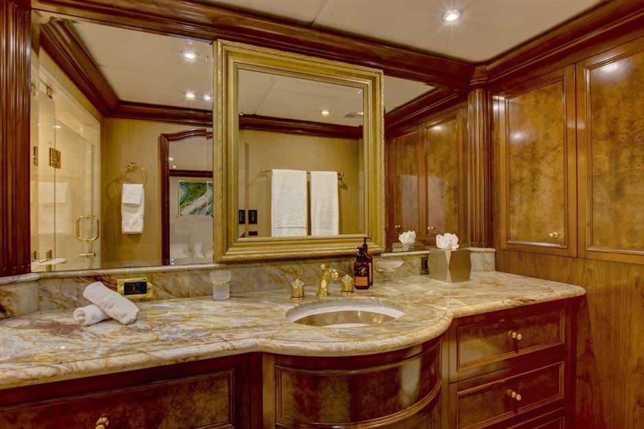 AQUASITION sleeps up to 10 guests in five beautiful staterooms. The lavish on-deck master stateroom boasts a king-size bed, beautiful cabinetry, large his and hers en-suite bathrooms, and a handsome private office. There are a further three spacious double staterooms and a twin on the lower deck each with the same luxurious styling and generous, marble-clad en-suite bathrooms.