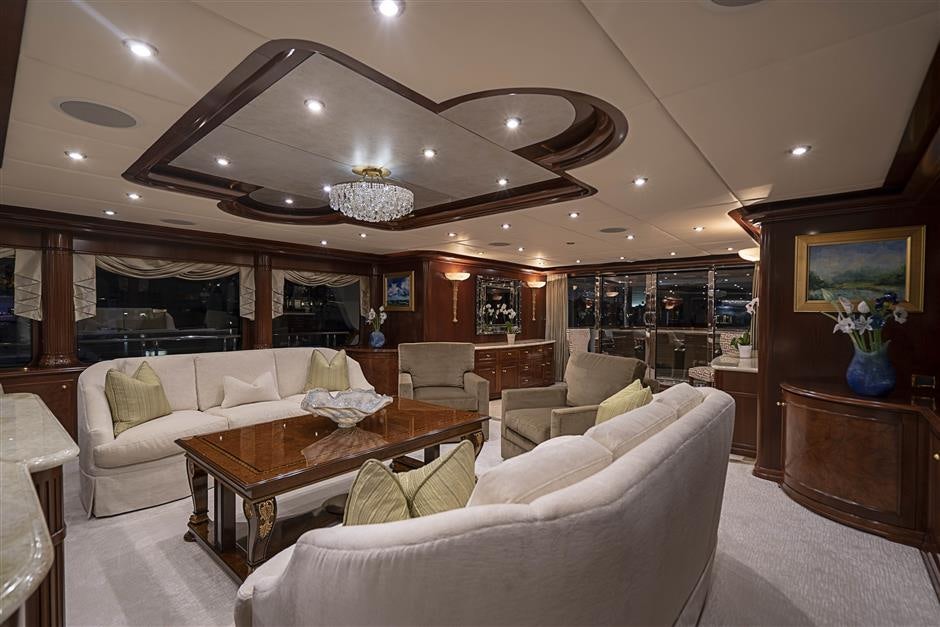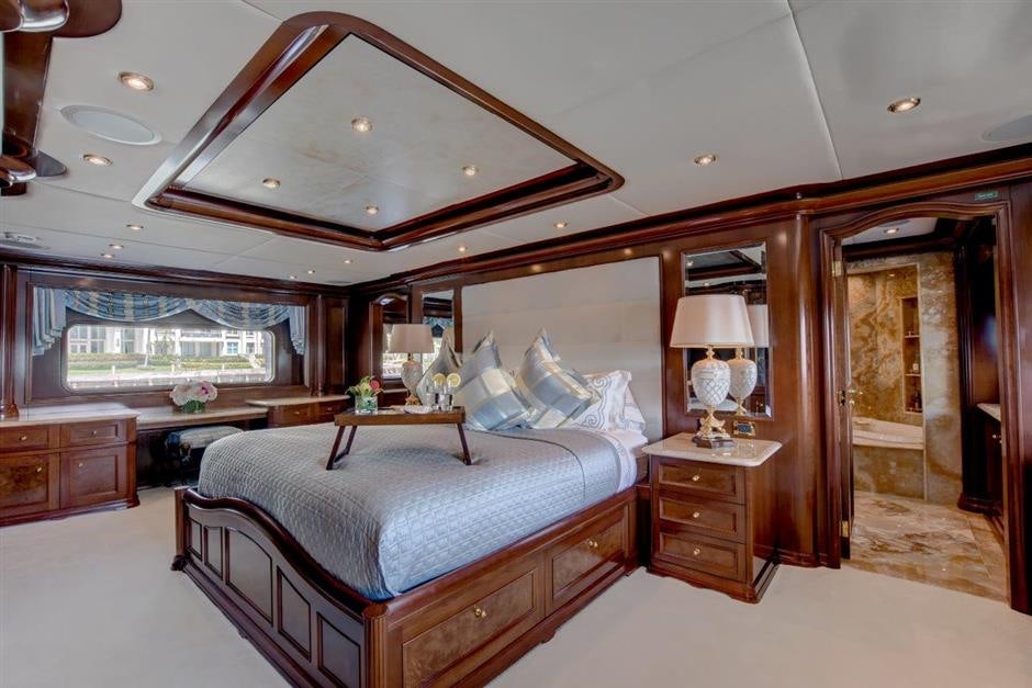 AQUASITION’s opulent interiors combine rich fabrics, warm wood paneling, cream marble and a neutral palette of creams and beige, with luxurious gold accents. The original artwork, sculptures and touches of glass add further touches of luxury to the traditional décor. The main salon features a comfortable lounge area with sumptuous sofas and beautiful detailing. Next door is the formal dining room with its Edwardian style glass and gold chandelier, exquisite joinery and seating for 10. The upper deck lounge is the perfect place for after-dinner drinks at the bar and entertaining. There are a beautiful games table and a lounge area for movie nights and relaxing.
