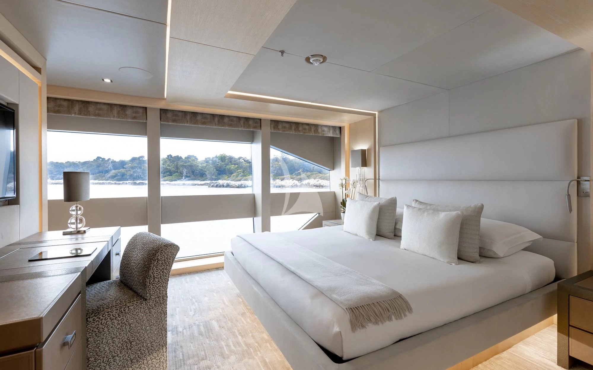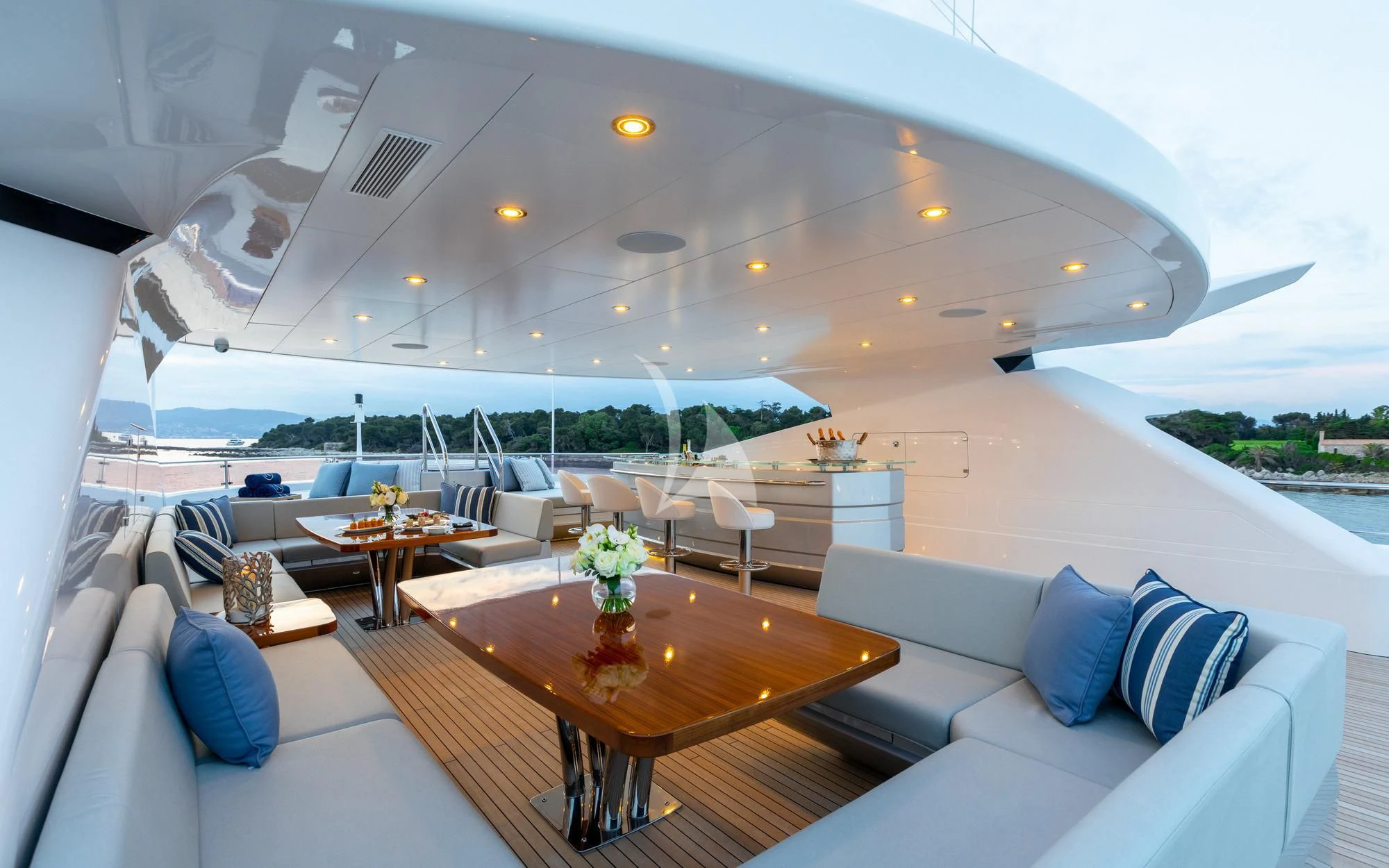 Superyacht ARADOS showcases a chic Zen-like interior adorned with sea-inspired colors complemented by light oak wood. Expansive windows fill the space with an abundance of natural light and blurs the lines between inside and out with endless views. Side balconies open off the main salon and upper deck enhancing the on-water experience and providing a private over-water retreat. Open spaces and plush furniture throughout the charter yacht create comfortable areas for socializing and relaxing.