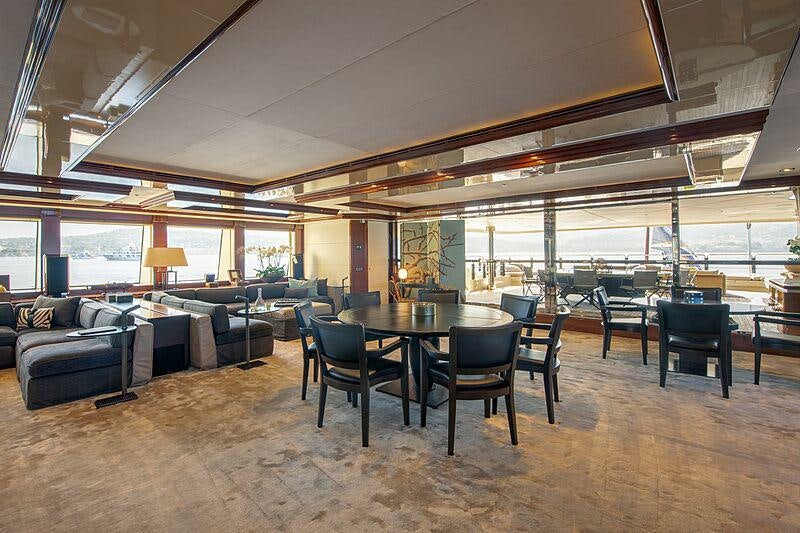 Outdoors is where ARBEMA really shines with incredible deck spaces designed to make the most of warm tropical nights and endless days under the sun. Her class-beating sun deck is clearly the jewel in the crown, with room enough for a large Jacuzzi/swimming pool, a laid-back lounge, sun pads, and a shaded central dining area with a bar. With the aft clear, the area doubles as a helipad allowing guests to arrive and depart in a discreet style. Outside the upper deck sky lounge there’s a gorgeous circular dining table for casual al fresco meals, while the main deck aft boasts a more formal shaded dining space with a round table of Wenge wood topped by opulent Carrara marble.
