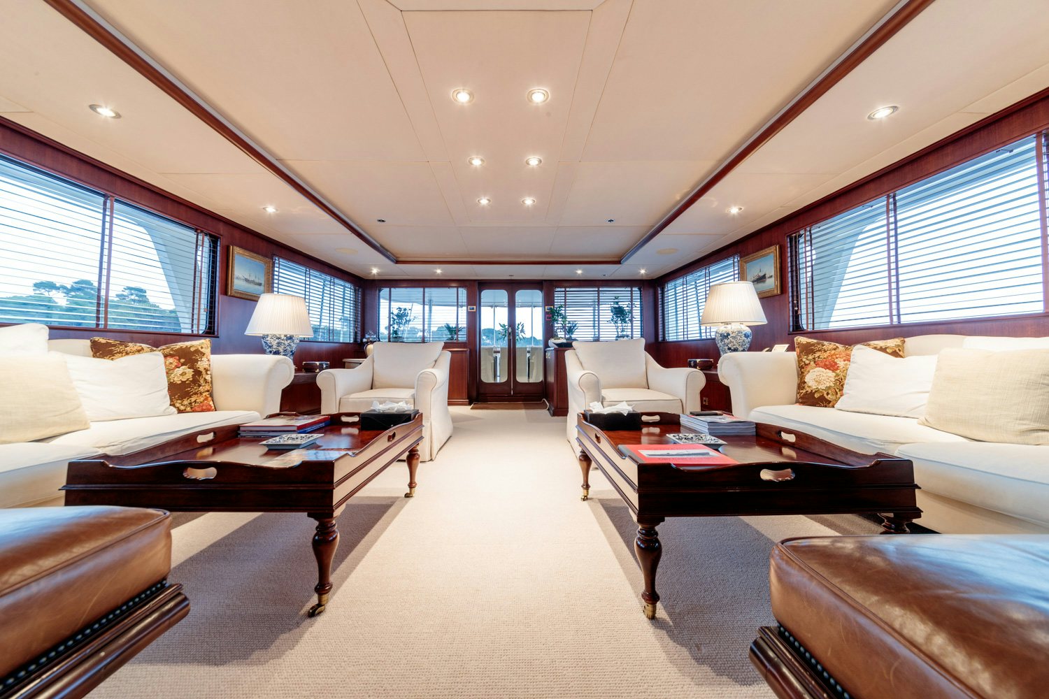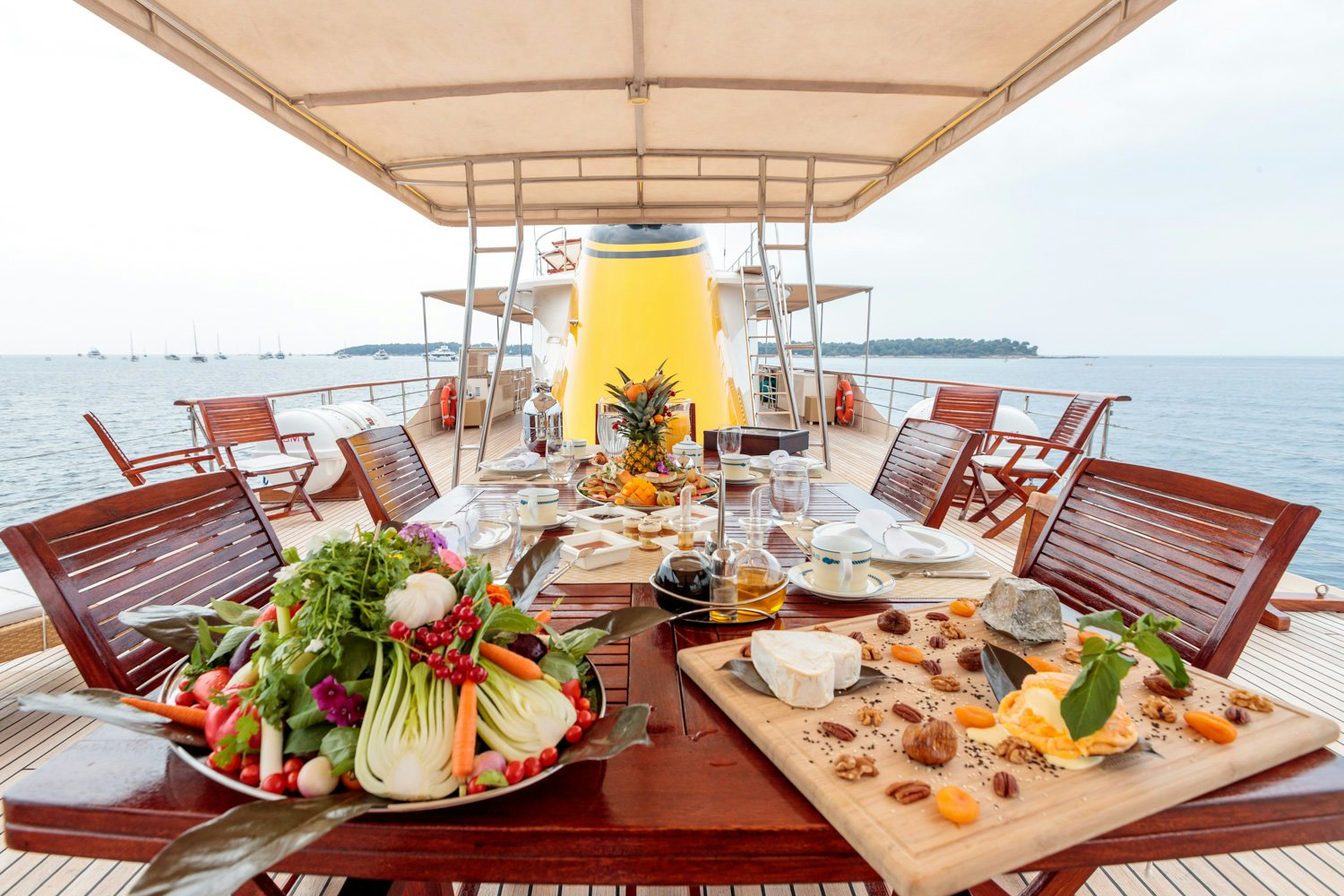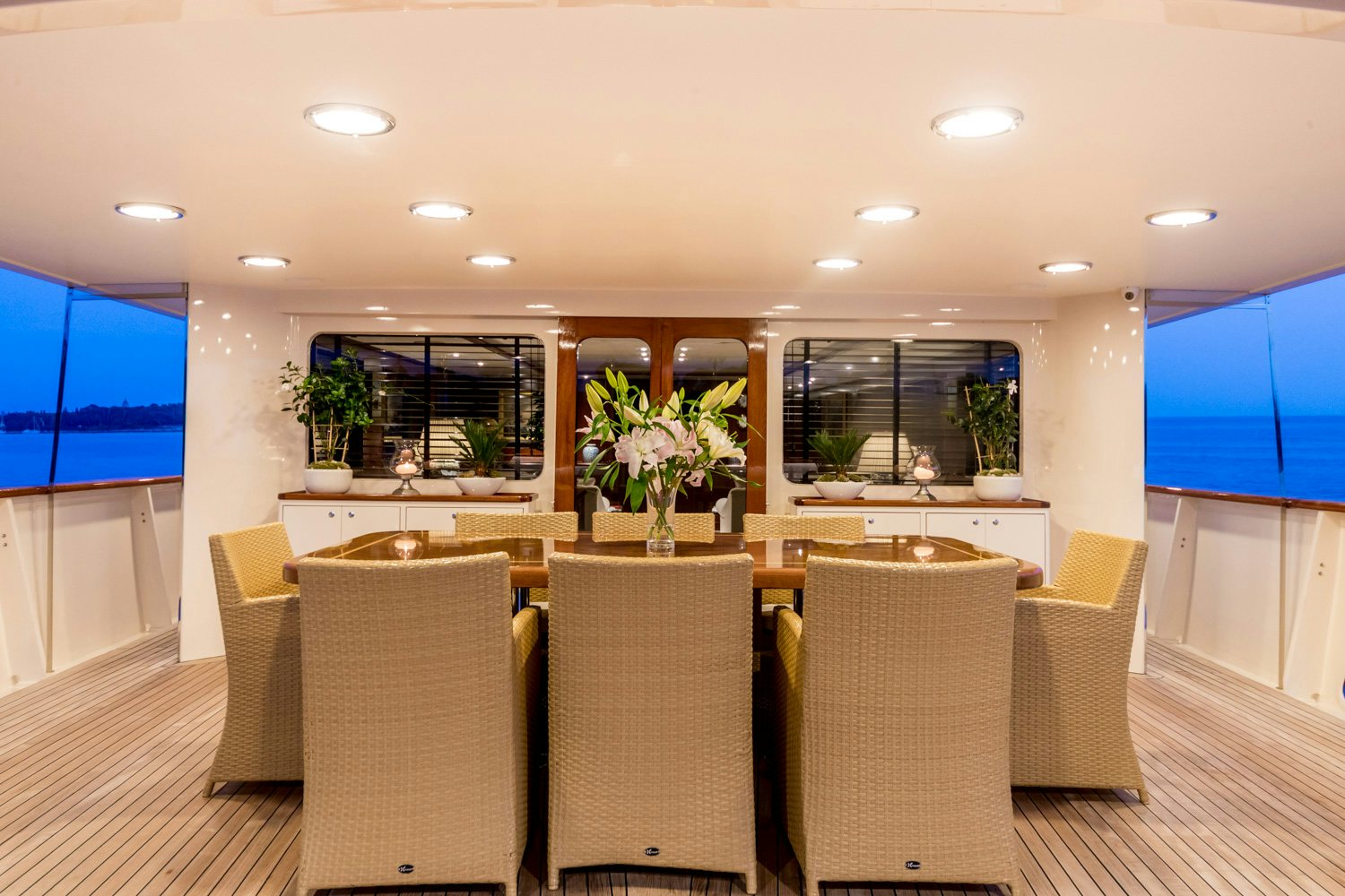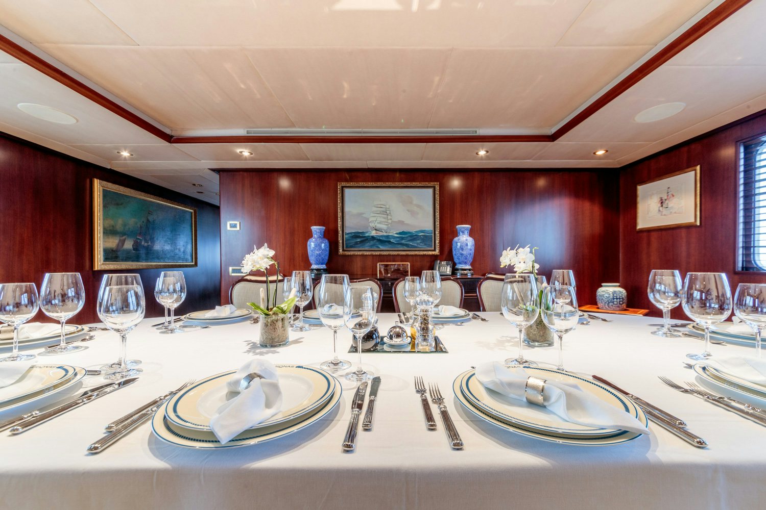 Guests will feel at home in ARIONAS’ welcoming interior with timeless styling. Throughout the interior of ARIONAS are vintage details and artwork that add to the unique charm of the interior. Large windows surround the main salon filling the space with an abundance of natural light. The main salon showcases crème-colored sofas and chairs that are perfectly complemented by rich leather ottomans and beautiful dark wood paneling to create an elegant yet comfortable atmosphere. The space offers seating on both sides, making it perfect for socializing and enjoying a full entertainment system for unwinding. Forward is formal dining, where guests will enjoy delectable meals created by the onboard chef.